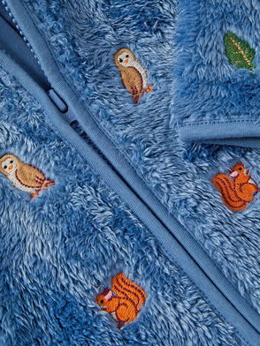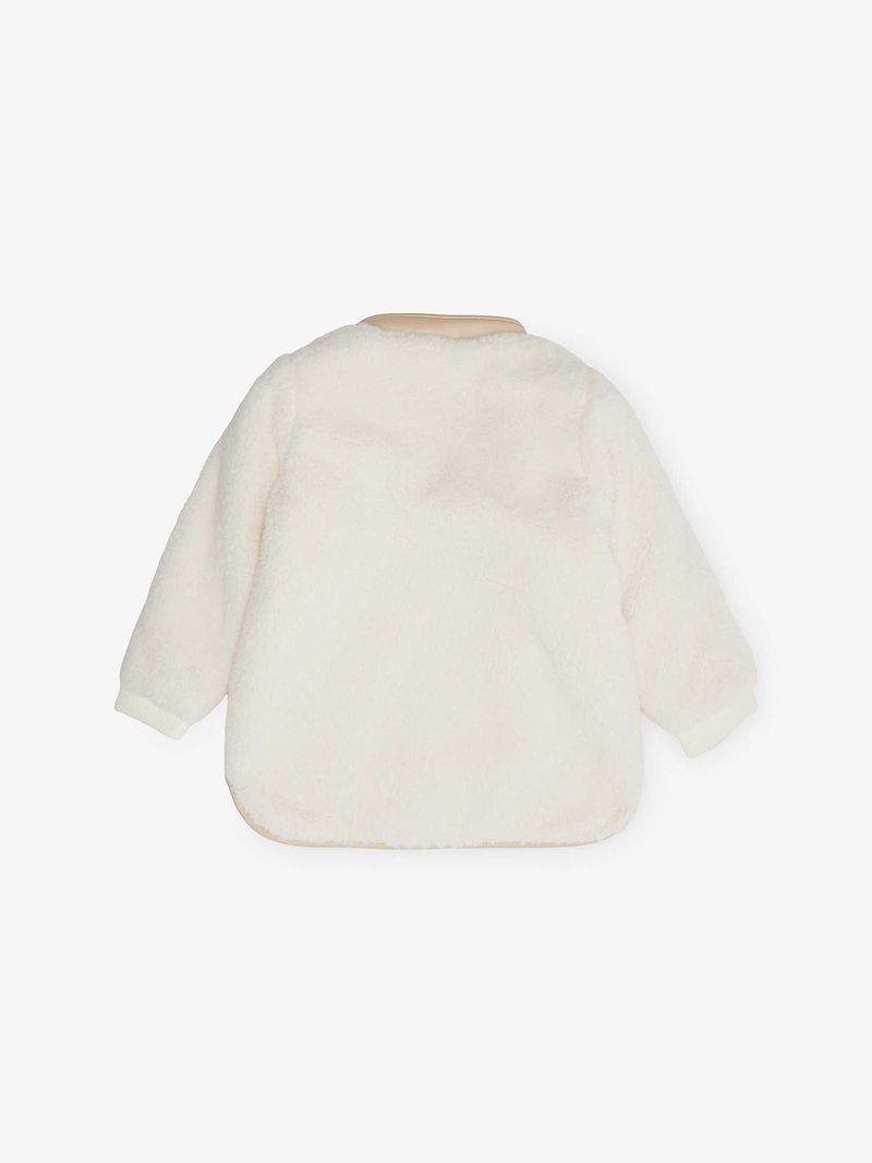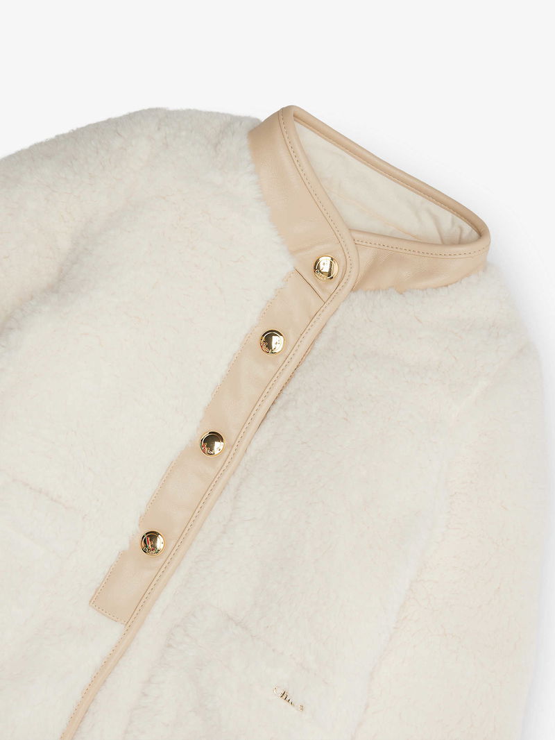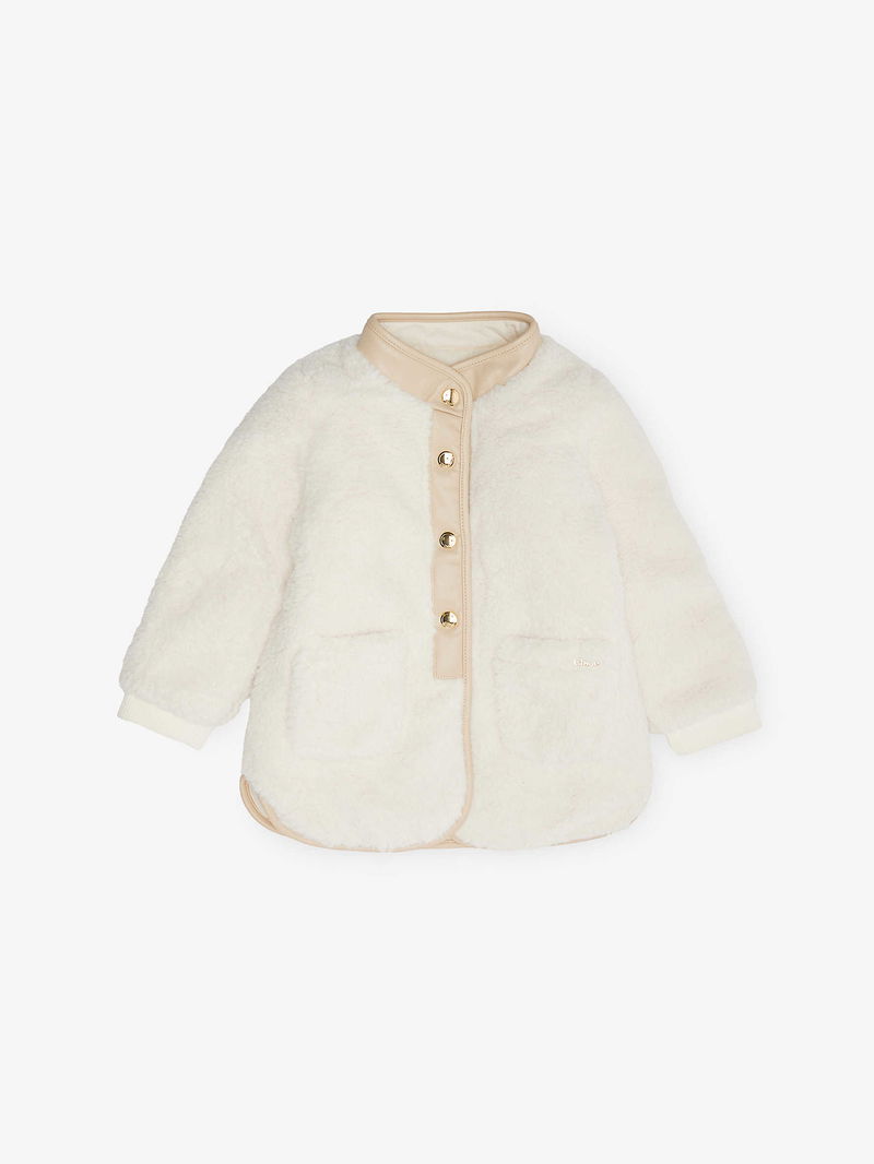 Chloé fleece coat. Stand collar, long sleeves, ribbed cuffs, two patch pockets at front, logo plaque at pocket, metallic trim, curved hem.