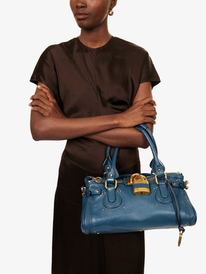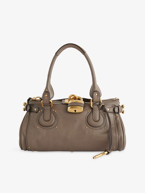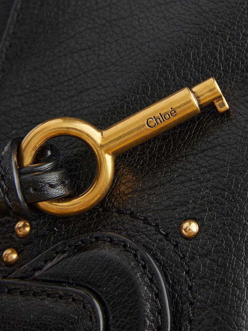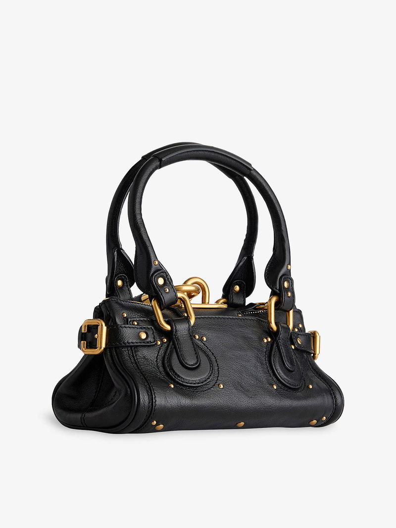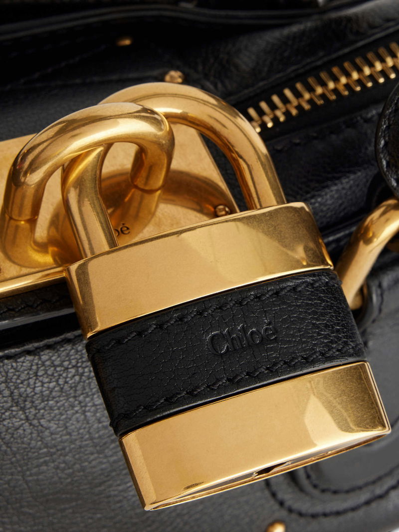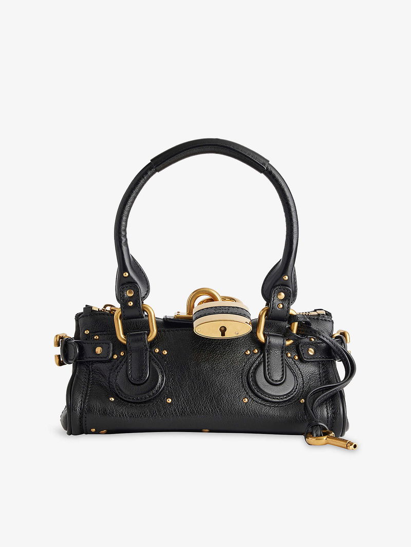 Chloé leather shoulder bag. Double top handles, branded padlock at top, detachable key and tag, all-over stud embellishment, all-over grained leather, gold-toned hardware, one main compartment, internal zip pocket and debossed branding, fully lined.