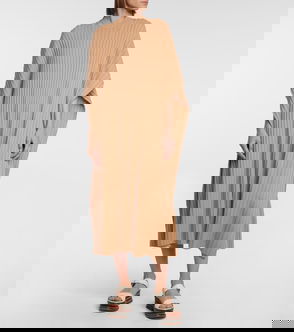 Chloé crafts this striped beige poncho from a soft blend of cashmere and silk that’s juxtaposed by a sporty quilted-shell collar.