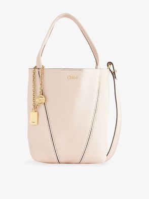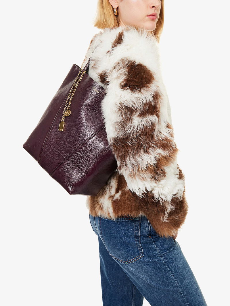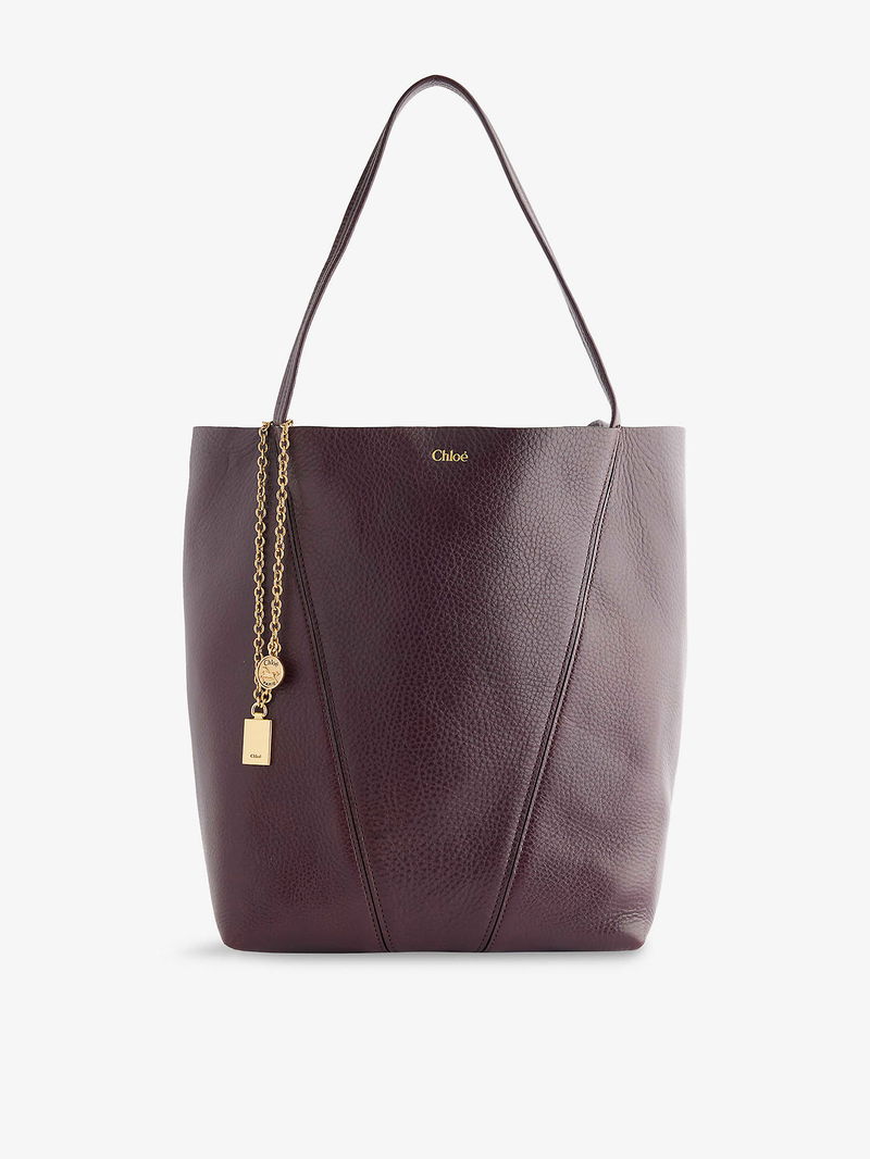 Chloé leather tote bag. Bucket shape, double top handle, foiled branding at front, link chains and plaque embellishment, all-over grained leather, gold-toned hardware, one main compartment, fully lined.