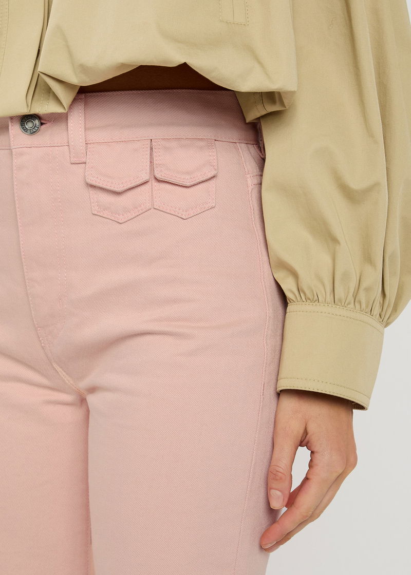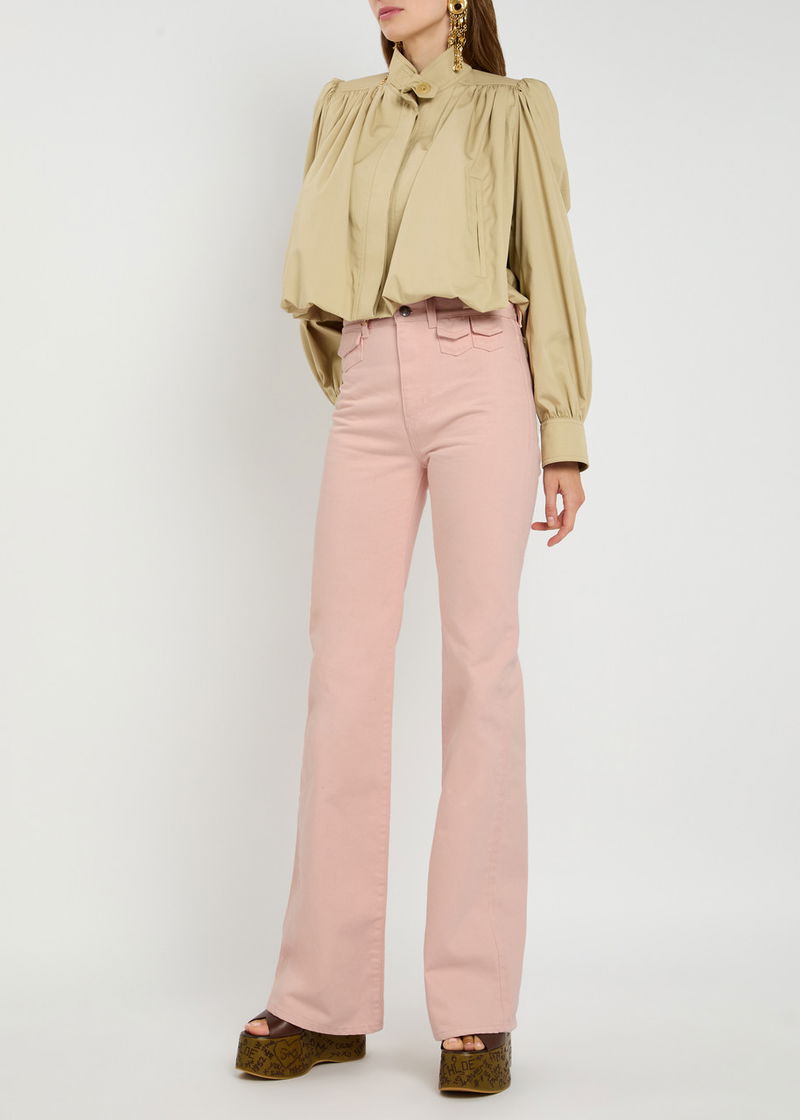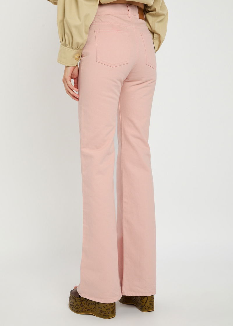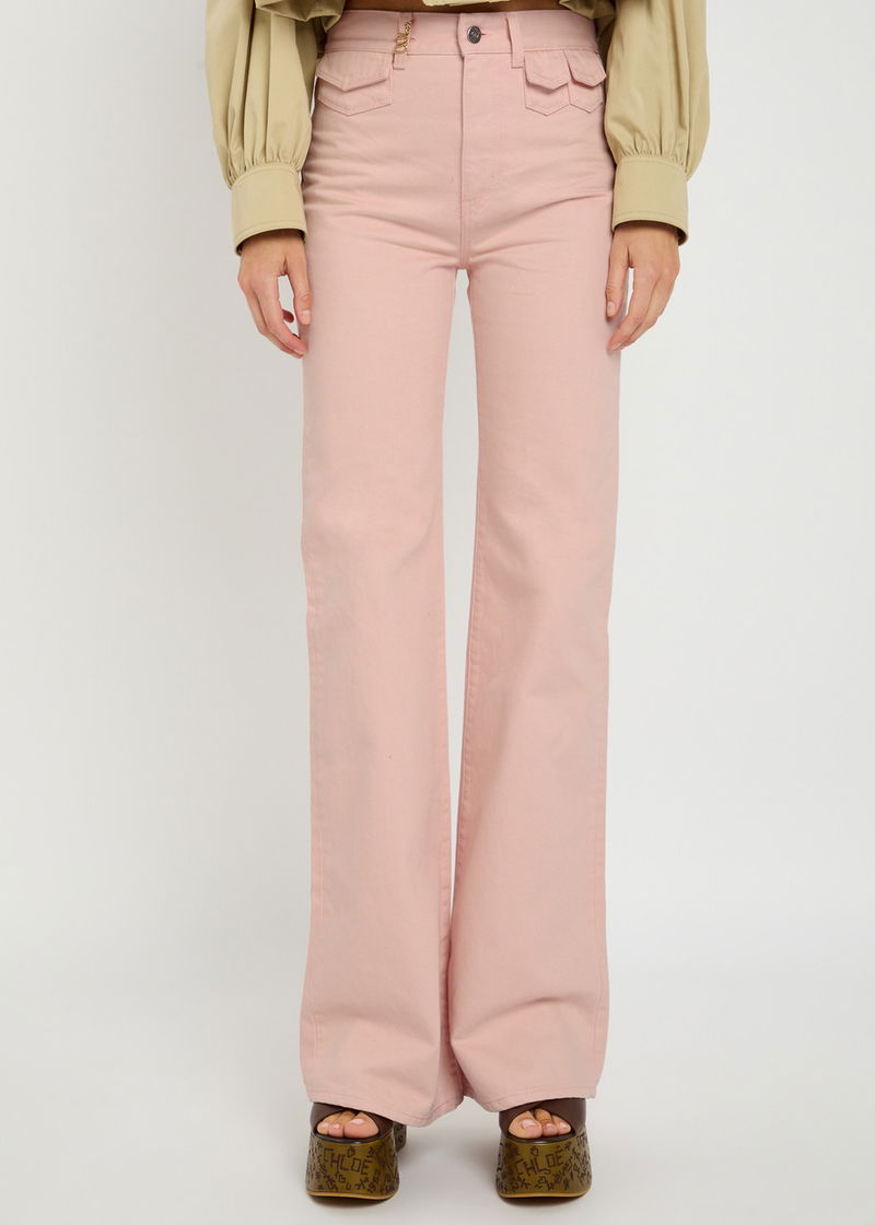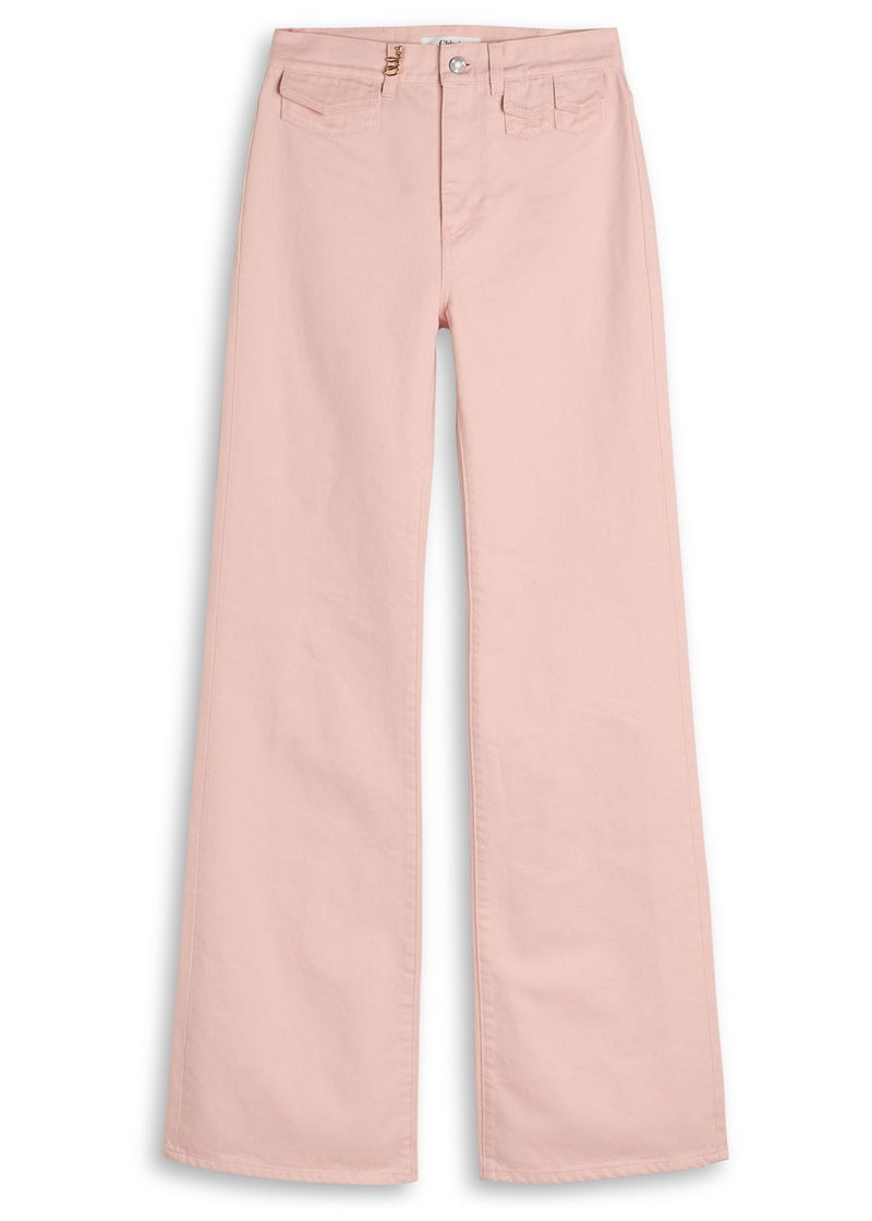 Chloé denim jeans. High-rise fit, slightly flared-leg cut, belt loops, three front flap pockets, designer plaque at front and back, two back patch pockets. Partially concealed button and zip fastenings at front.
