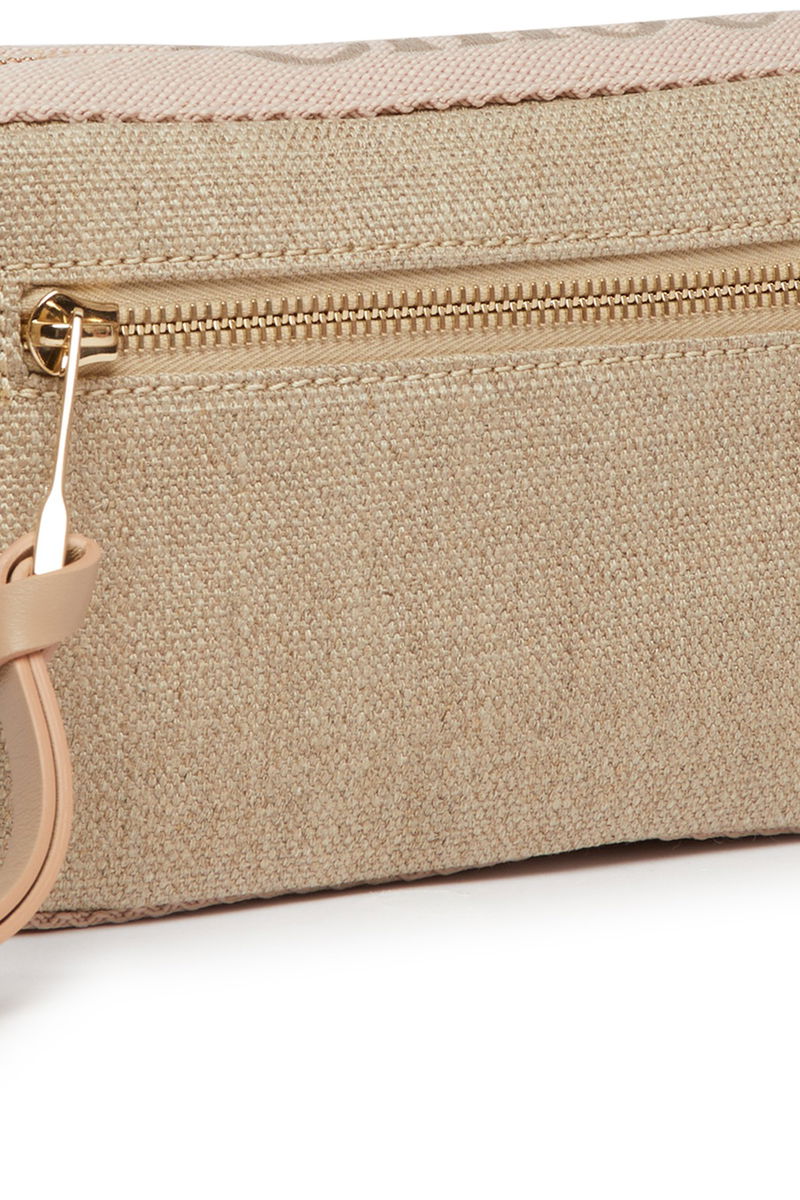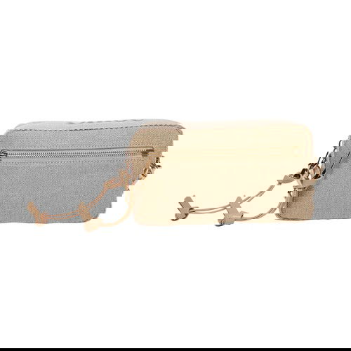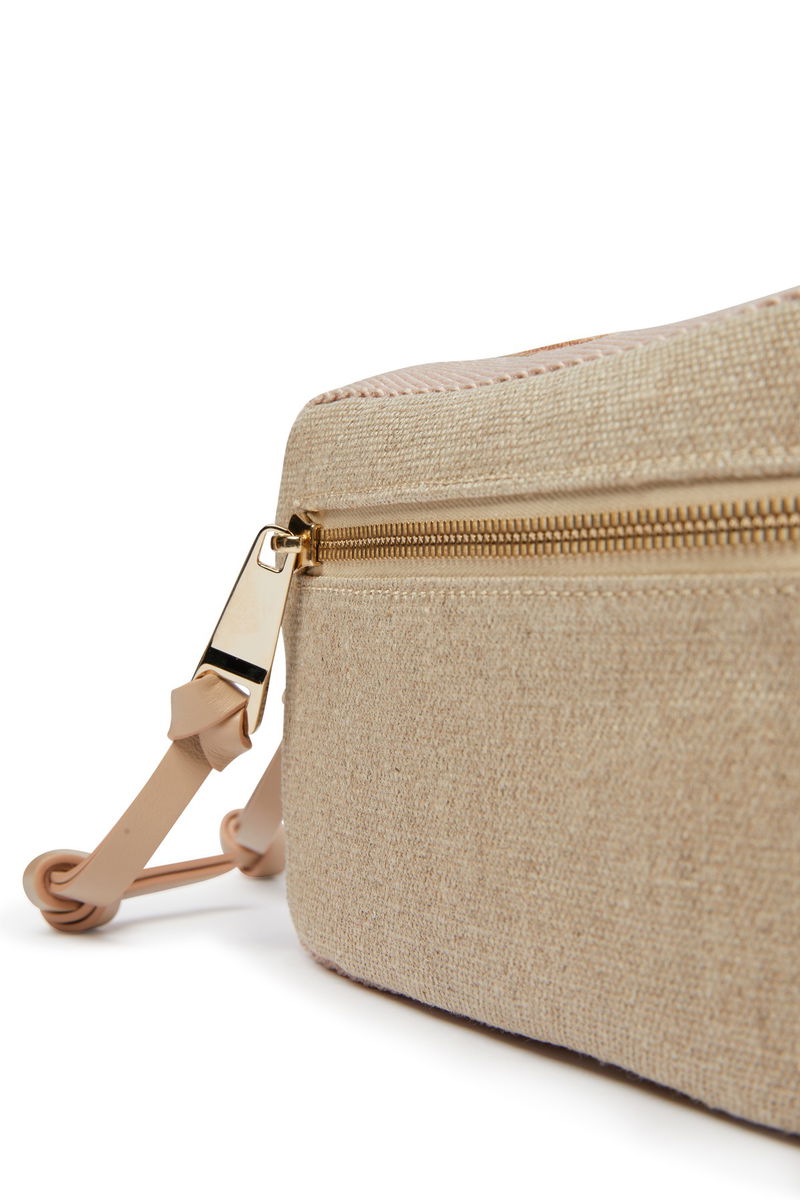 Thin strap. A handle. Zippered front pockets. Visible stitching. Front logo.