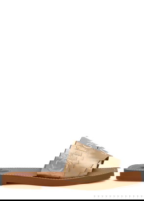 Chloé ivory leather slippers. Designer-stamped canvas taping, gripped brown rubber sole, round toe. Slip-on. Come with a dust bag.