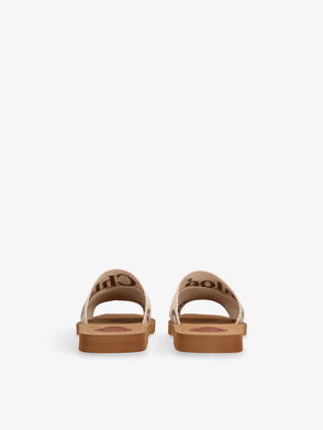 Chloé pink canvas sliders. Logo-print straps, brown rubber sole, square open toe Slip-on.