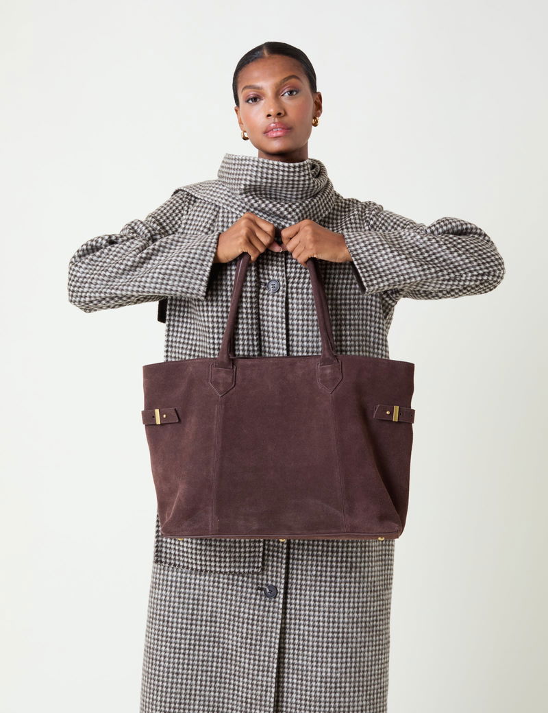Coming in chocolate brown, this suede tote bag is designed in an over-the-shoulder style. It features gold stud detail, gold base studs and two inside pockets. Made from buttery-soft suede, each piece features its own unique texture and tone.
