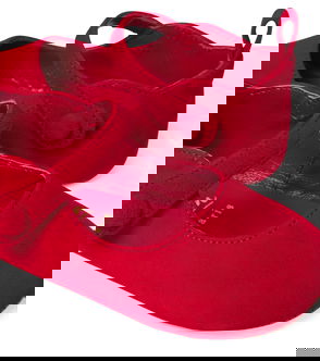 The classic style has a buttoned strap and the brand's iconic scalloped edge and red soles.