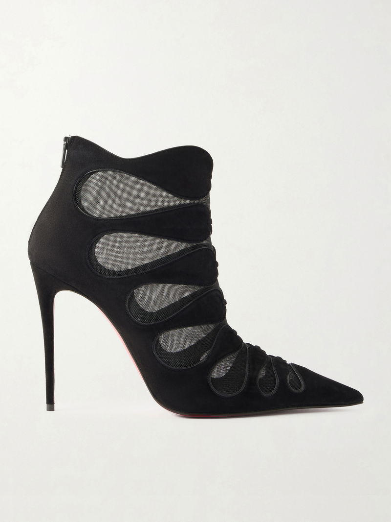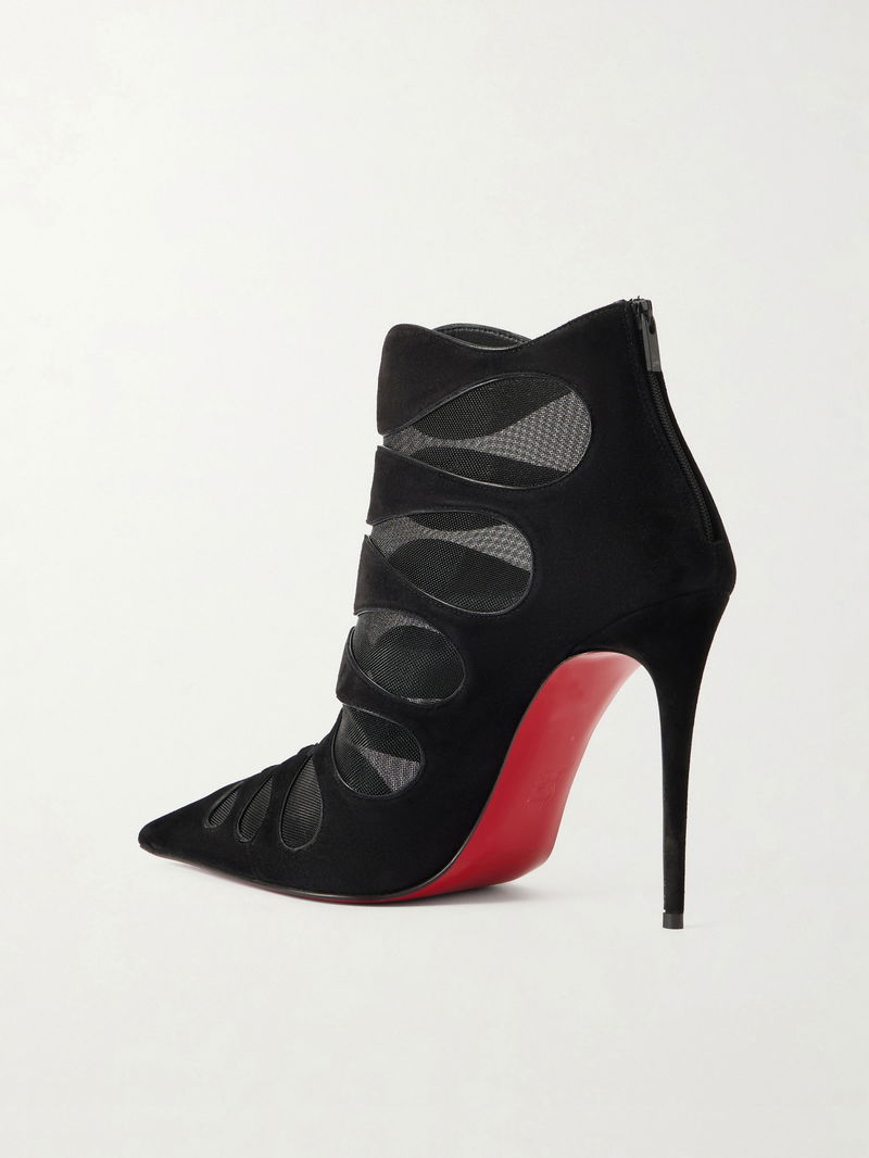 These 'Circus Max' ankle boots channel Christian Louboutin's iconic approach to glamour. Crafted from smooth suede, they feature mesh inserts that beautifully frame and reveal the foot. The stiletto heels are designed to showcase the signature red soles.