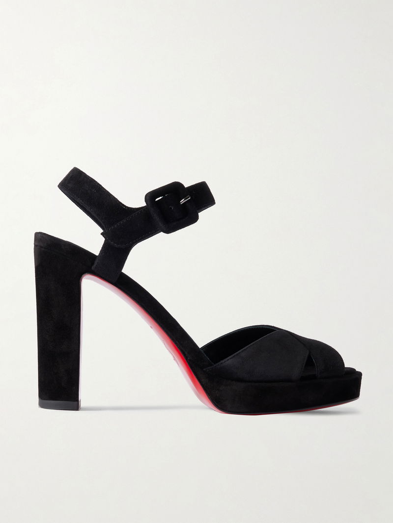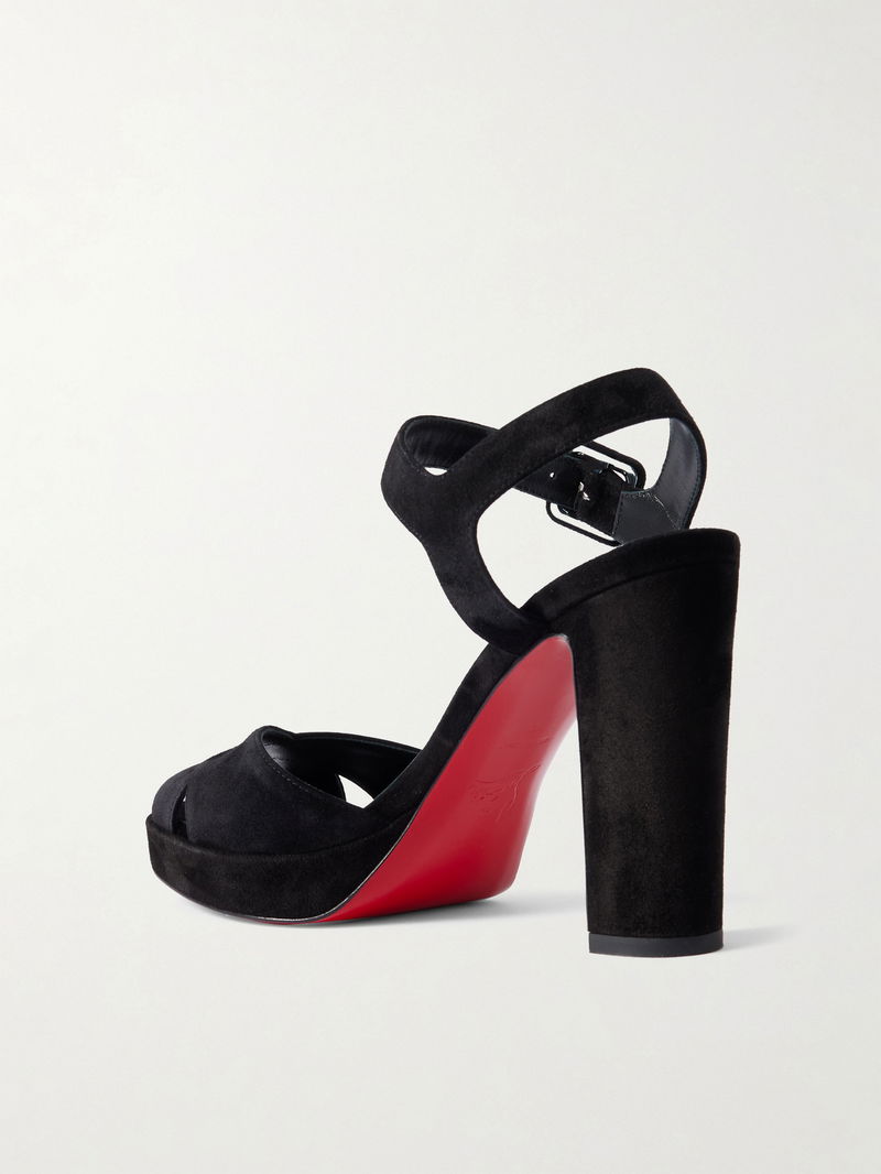 Christian Louboutin's 'Cora' sandals effortlessly transition from day to evening. Crafted in Italy from supple suede, they have a round open-toe silhouette framed by crossed straps and a bold tonal buckle at the ankle. Towering 100mm block heels subtly reveal the signature red soles.