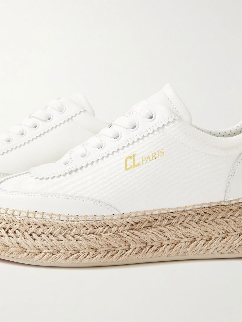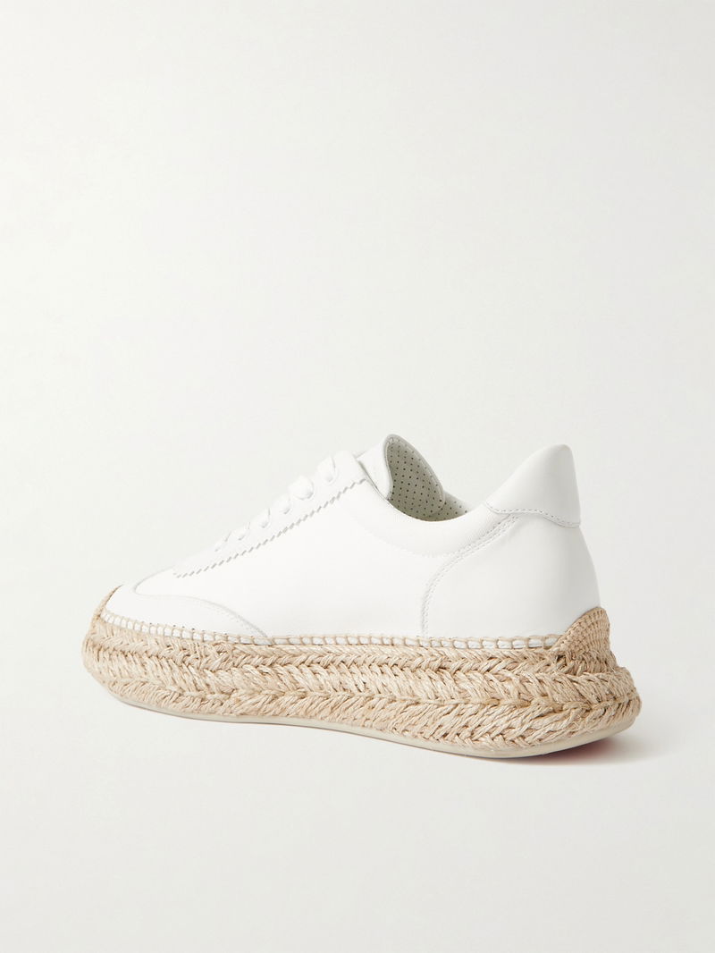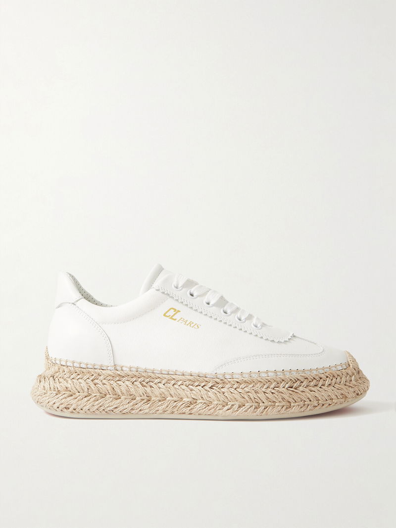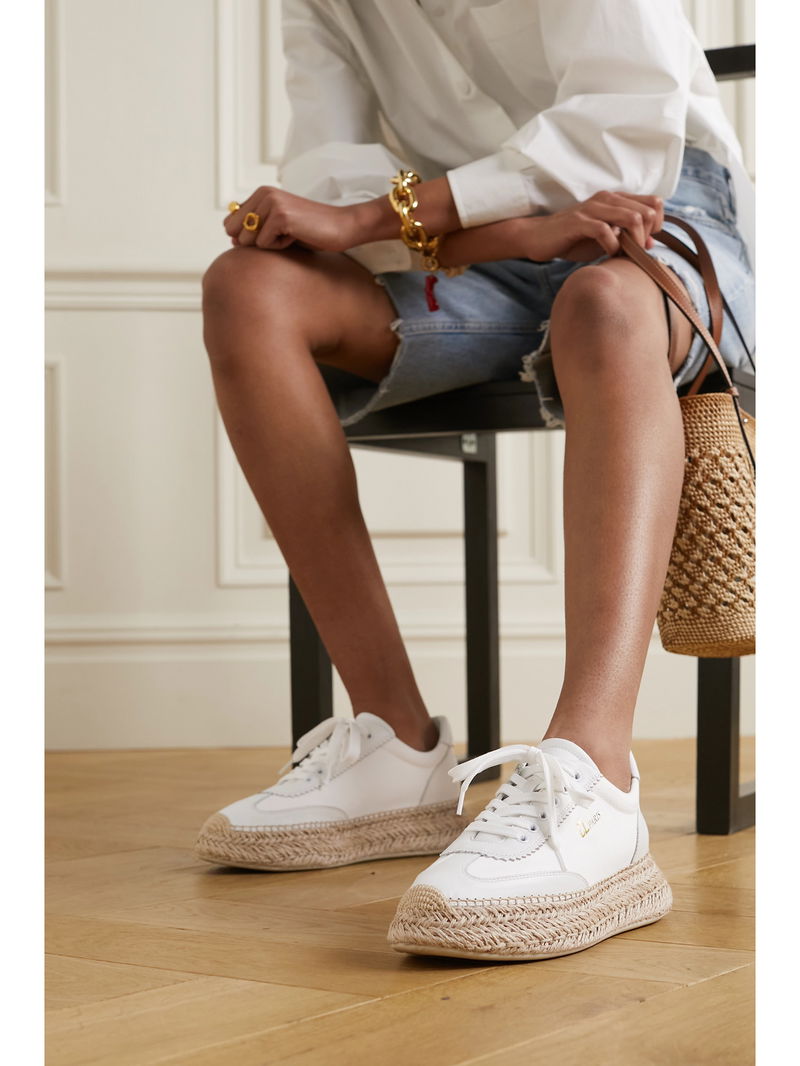 Christian Louboutin's shoes combine sneakers with traditional espadrilles, making them perfect for warm days. Made from optic white leather, they're detailed with a gilded 'CL Paris' motif and set on braided jute platform soles, with a layer of rubber for traction in the maison's signature red hue.