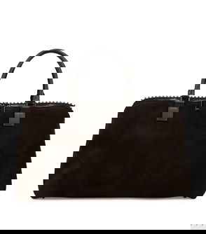 Supple leather serves as a canvas upon which the brand's signature spikes are scattered, creating a stark contrast with the smooth and spacious scarlet interior.
