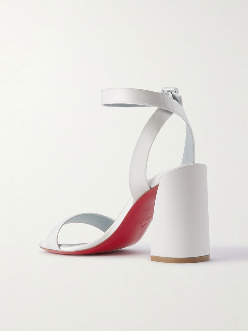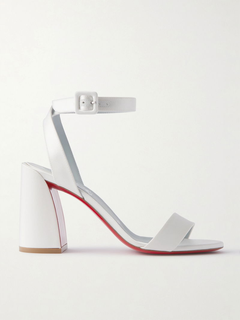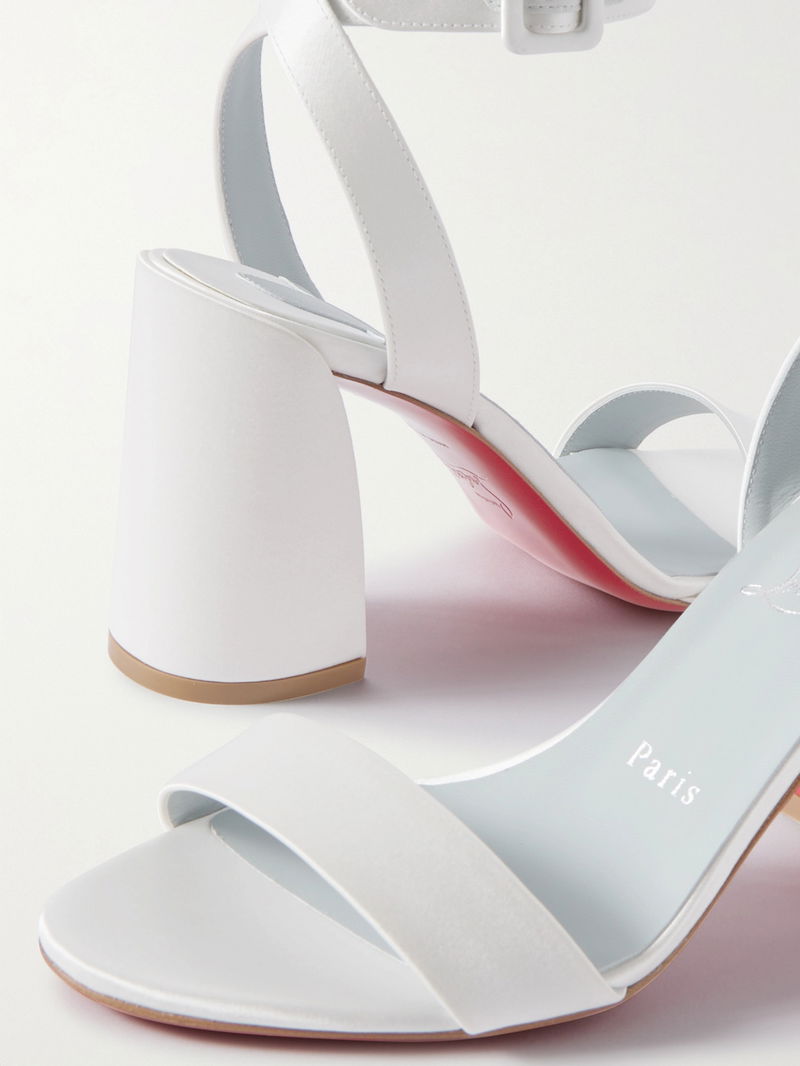 Christian Louboutin's 'Miss Sabina' sandals are made from lustrous white satin, so they feel particularly elegant. Set on sturdy block heels, they have signature red soles and a two-strap design with a buckle at the ankle to adjust the fit. Wear them with cropped pants or dresses.