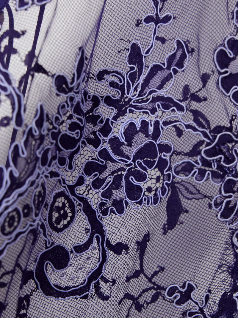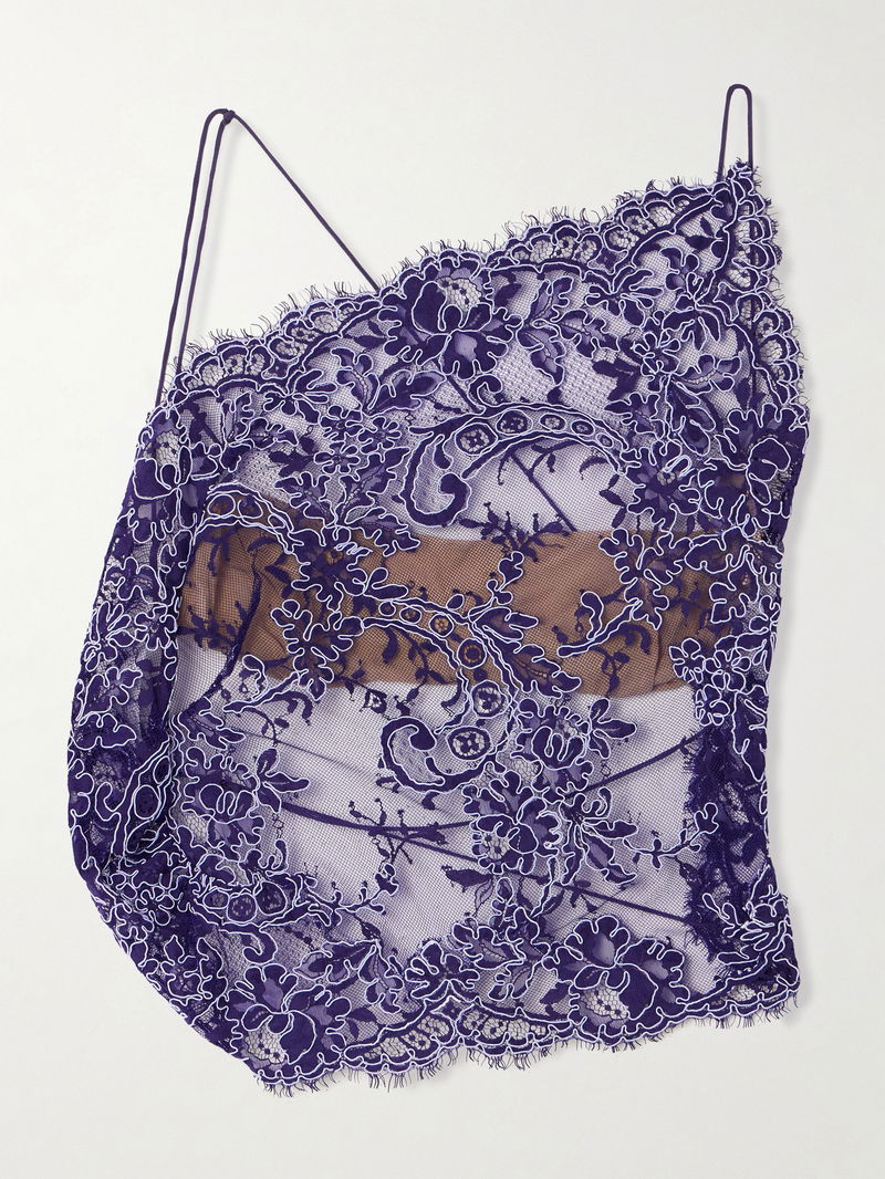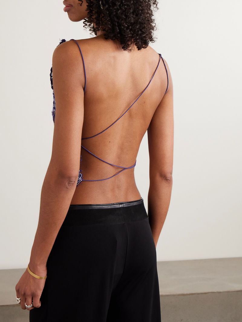 Christopher Esber's 'Iris' top is delicately embroidered with florals in 'Dark Viola' threads. It's made from semi-sheer lace and net and has an open back that's draped with asymmetrical straps.