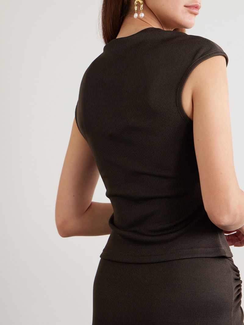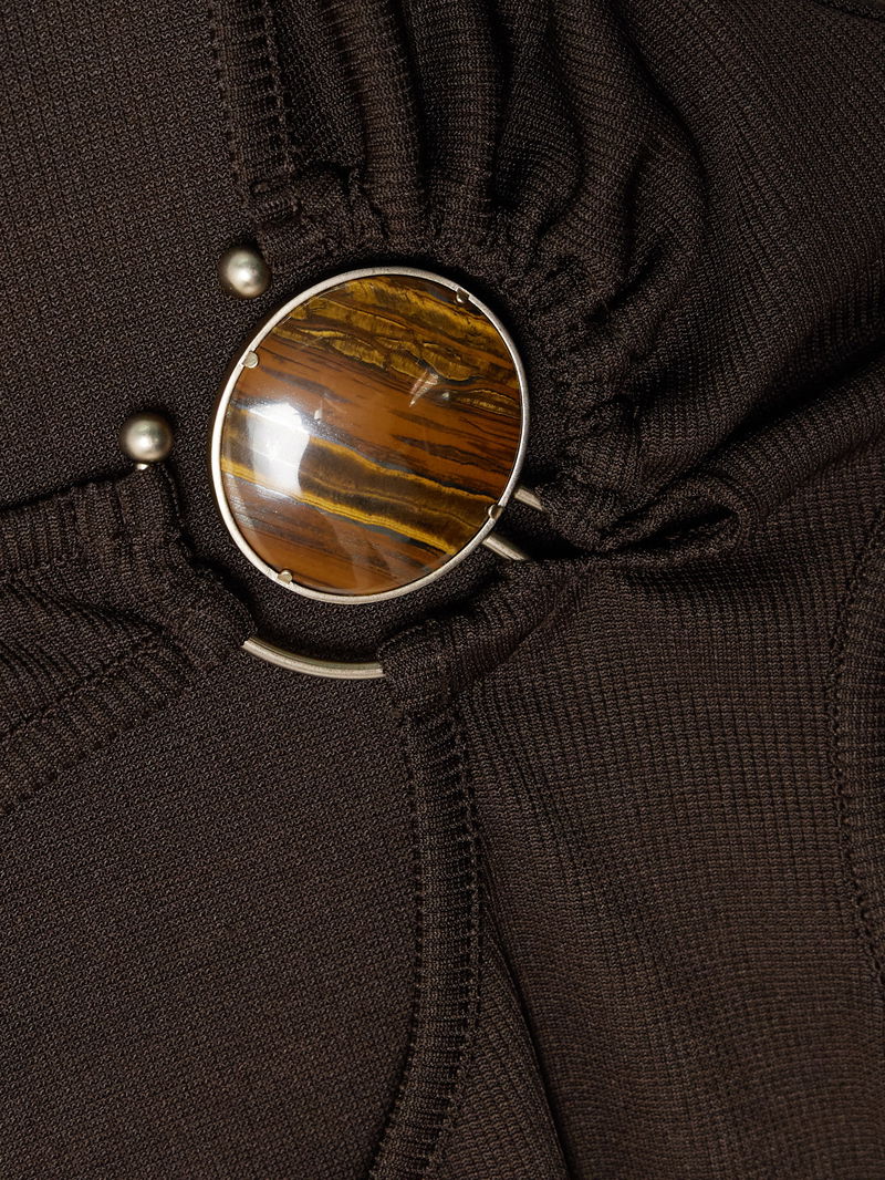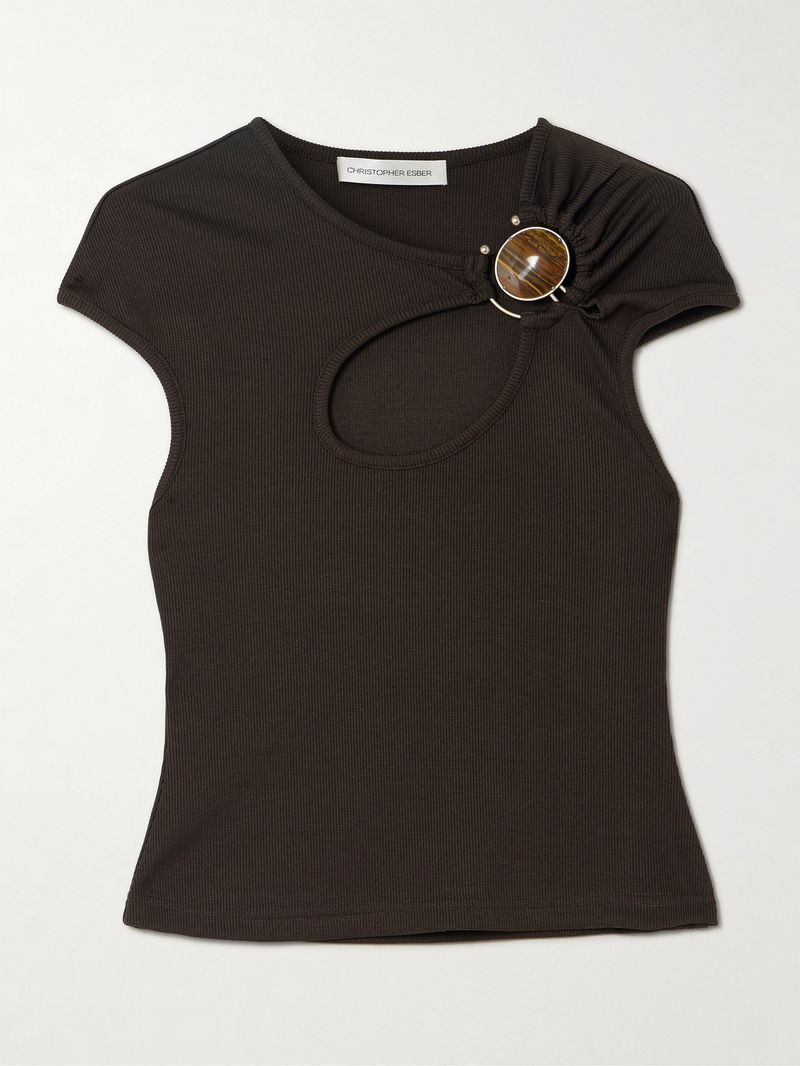Christopher Esber reimagines the classic T-shirt with this embellished take. It's cut from espresso-colored ribbed stretch-jersey in a contouring fit with cap sleeves. The asymmetric keyhole neckline is looped with tiger's-eye resin hardware.