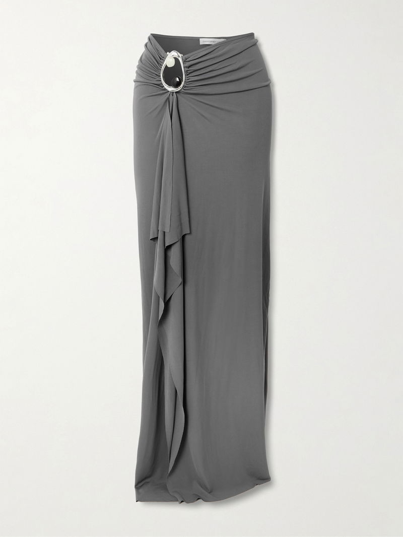The fluid drape of Christopher Esber's 'Orica' maxi skirt enhances its asymmetric, wrap-effect profile. It's detailed with a cutout, ornamented with sculptural silver-tone hardware, encrusted with twinned stones and ruched to draw the eye. Pair yours with the same-named top in our edit.
