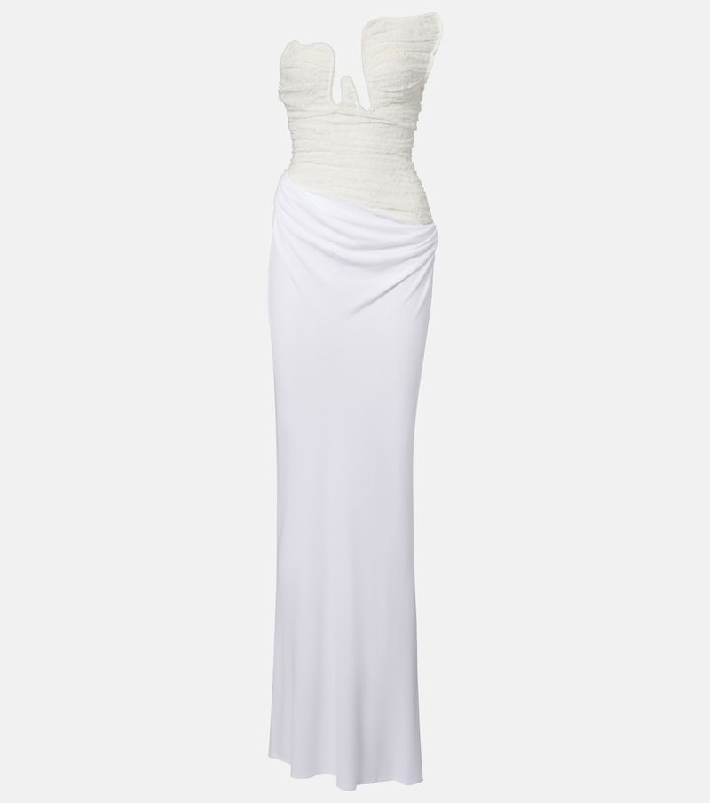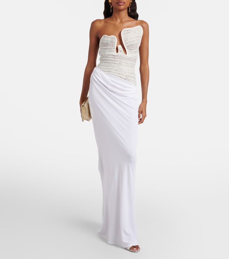 Christopher Esber's sensual cuts and sculptural hardware make for a contemporary twist on minimalism. Complete with a lace bodice and jersey skirt, the Salacia gown is characterized by its ruched details and an asymmetrical strapless neckline.
