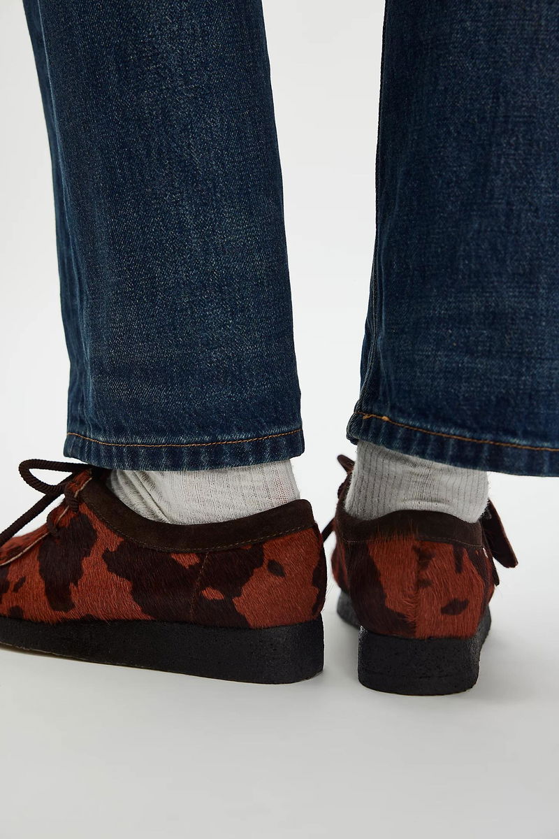A playful, textured take on a staple shoe from Clarks, these Wallabees feature hair-on leather uppers, a stunning cow print, and suede details for a unique combination of textures and materials.