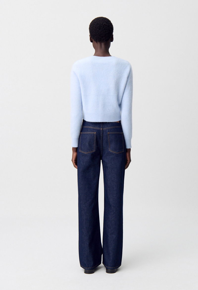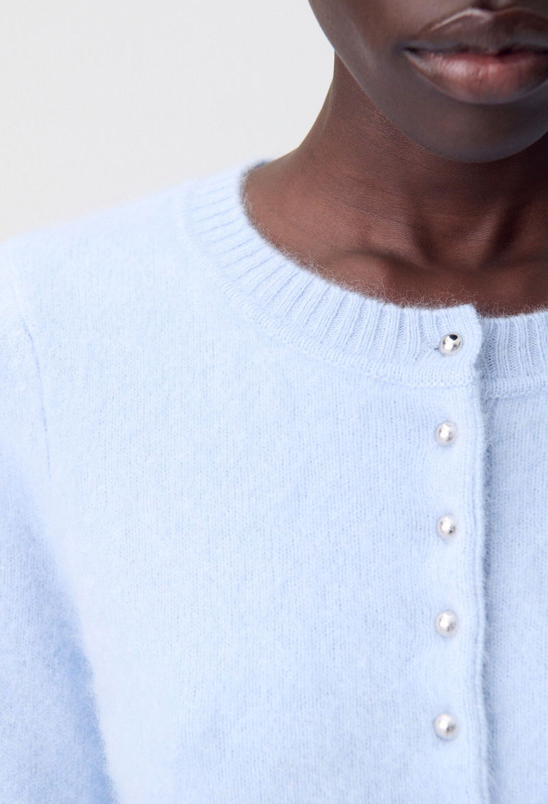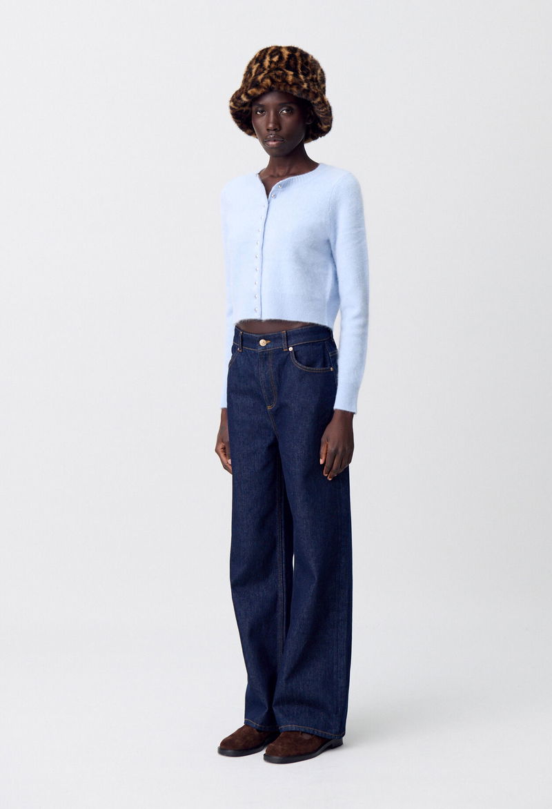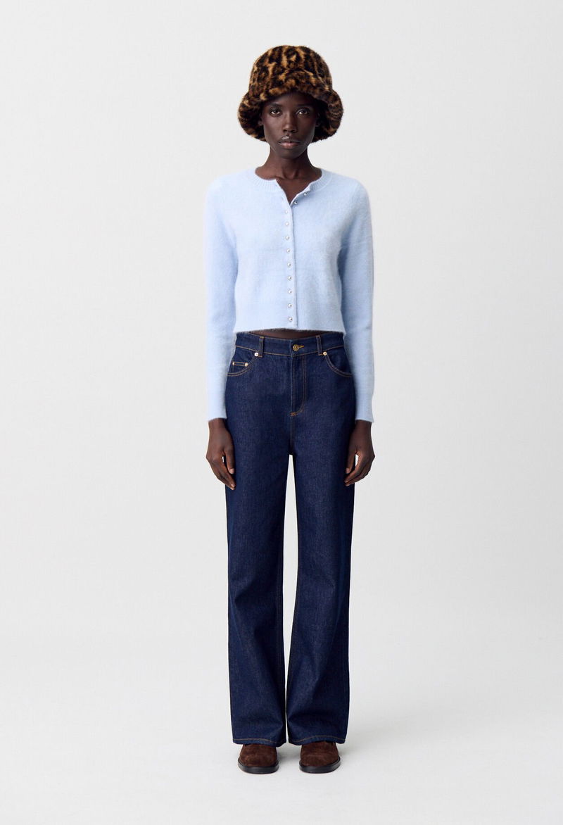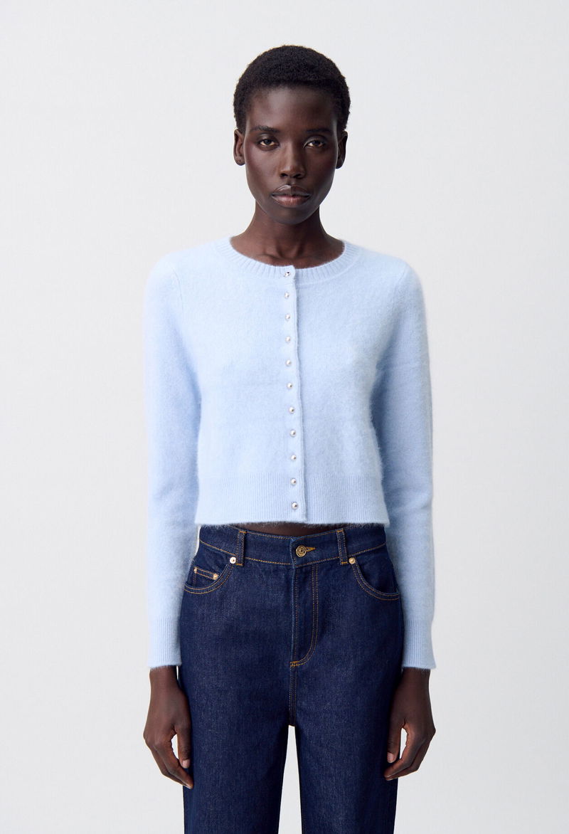 This historically masculine wardrobe has been completely reinvented in a feminine version. Pastel colours - parma or sky blue - and mischievous details, like the jewel button, make up a silhouette that blends formal codes with a casual spirit.
