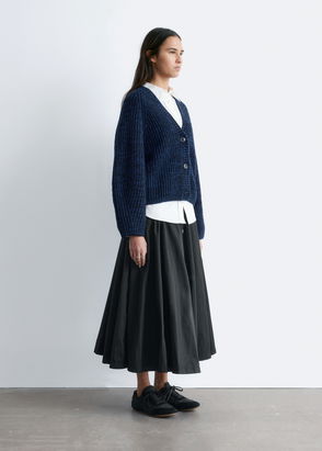 Long sleeveless cardigan. Ribbed knit on the neckline, armholes and hem. Fancy buttons. V neck.