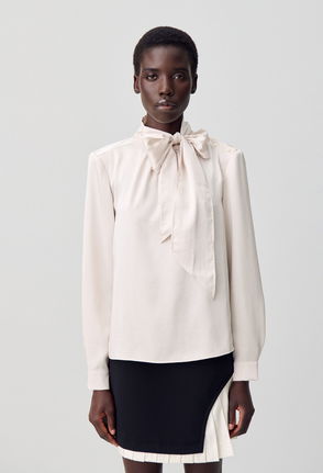 Ecru flowing blouse. Folded neckline. Fancy gold buttons. Long sleeves. Flared cuffs. Wide open collar.
