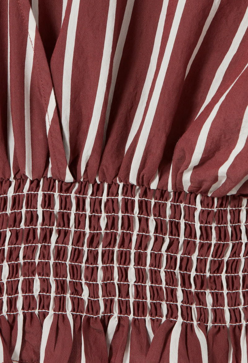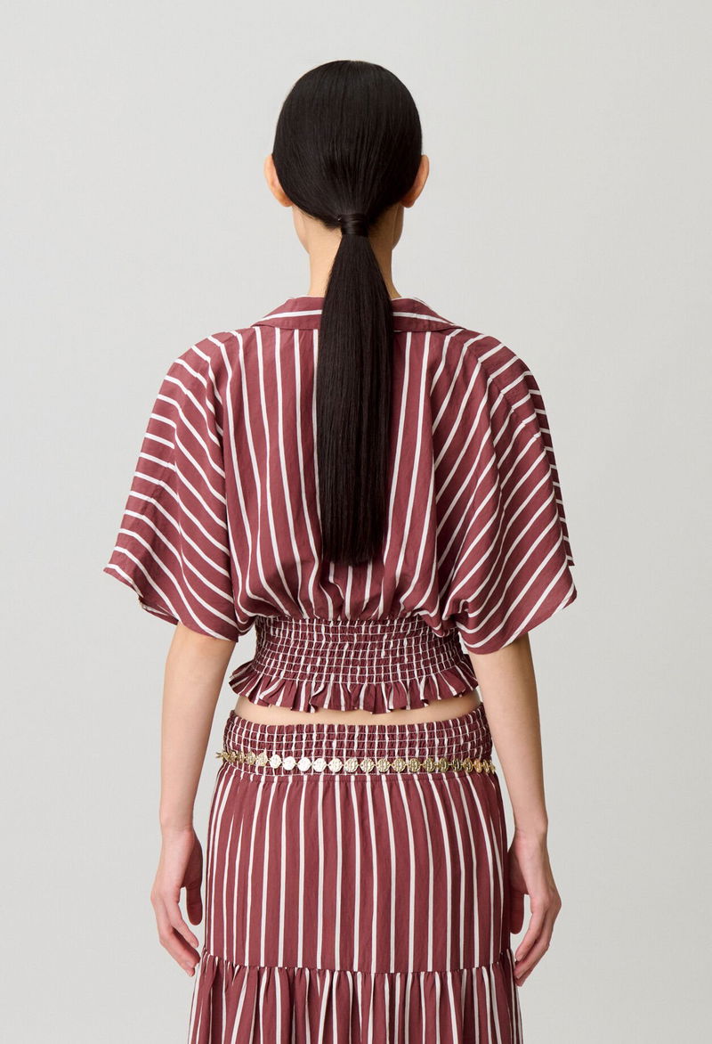 Flowing striped top with a shirt collar and wrap neckline.