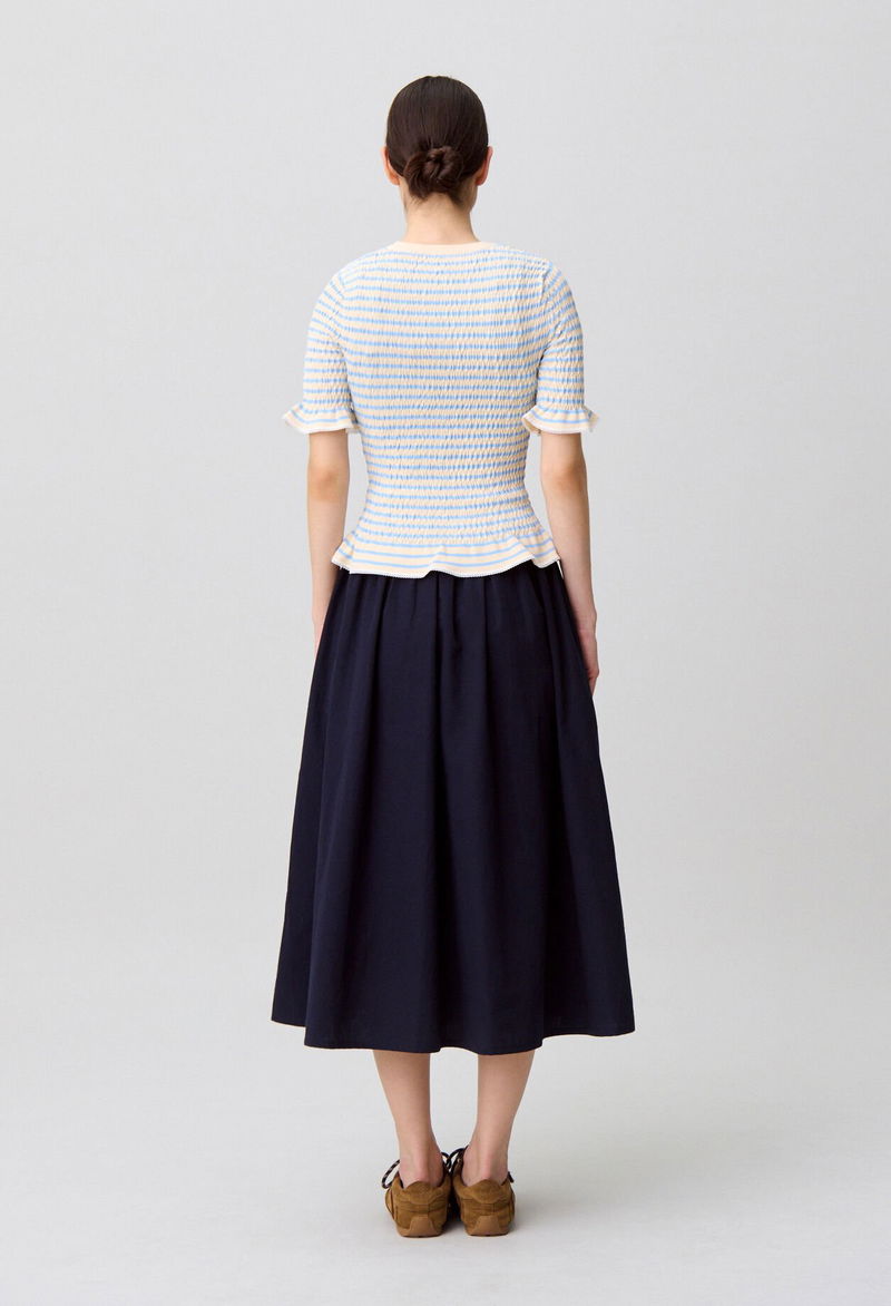 Short-sleeved smocked knit top with refined finishes.
