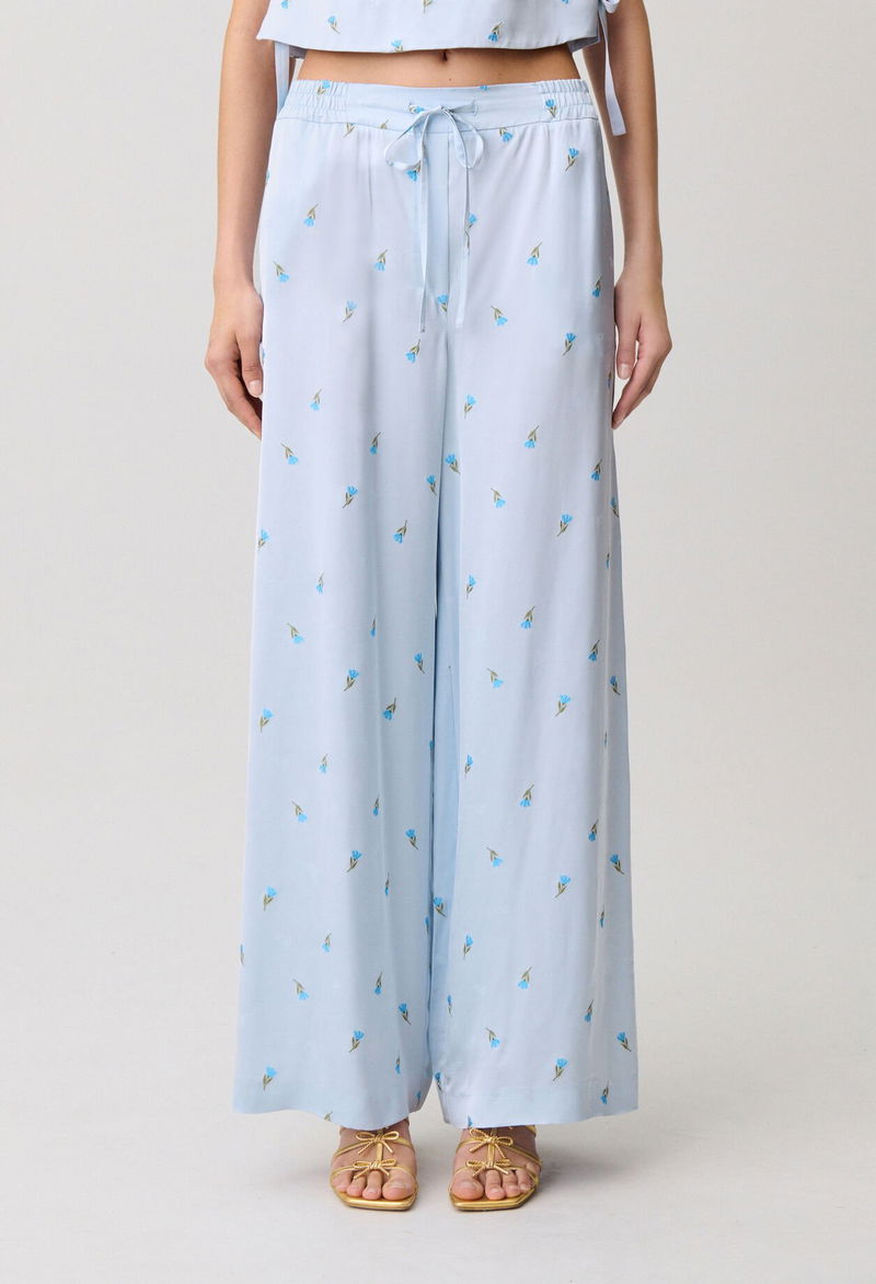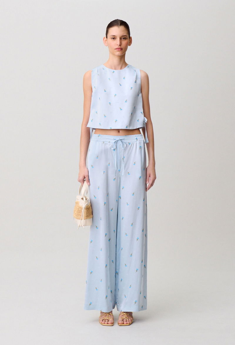 Lightweight embroidered satin trousers with long, wide legs for an elegant look.