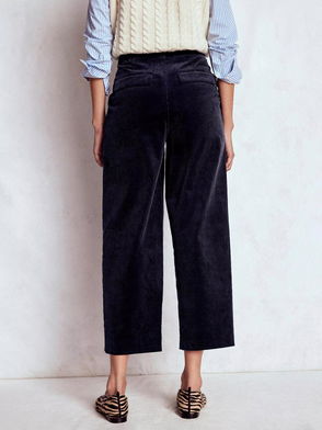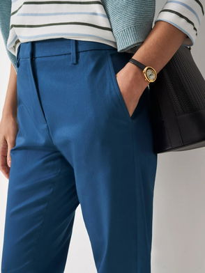 Suit trousers. Straight fit and mid-rise waist. Ironed creases down the middle of the legs and at the back 2 slant pockets 2 welt pockets on back. Zip and button fastening.
