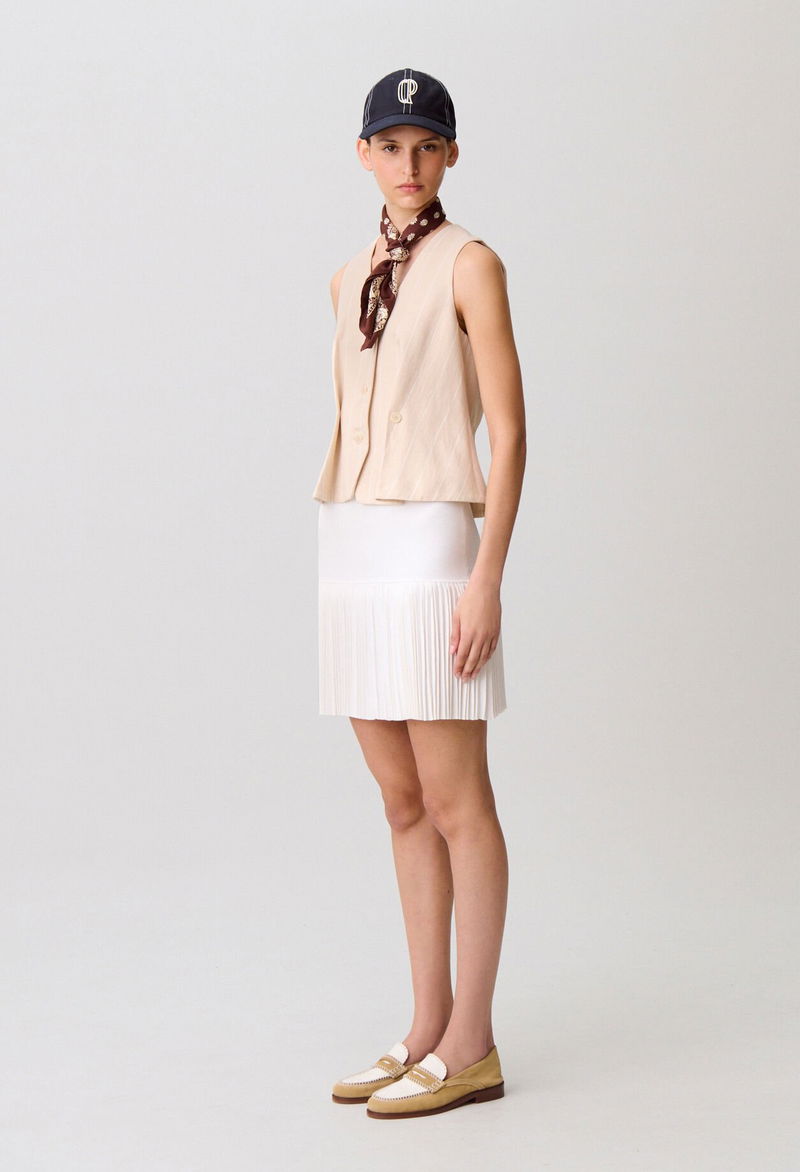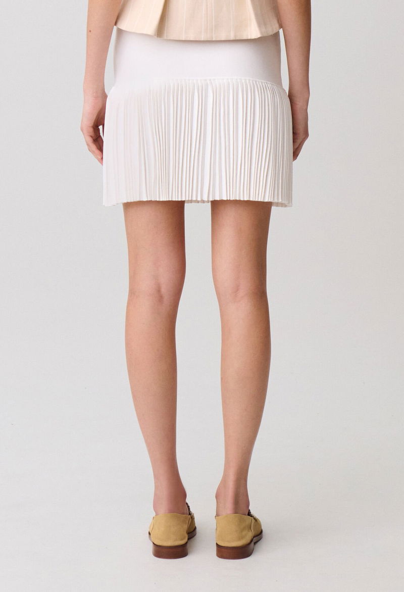 Short pleated skirt in ecru knit, high waist and fitted at the waist.