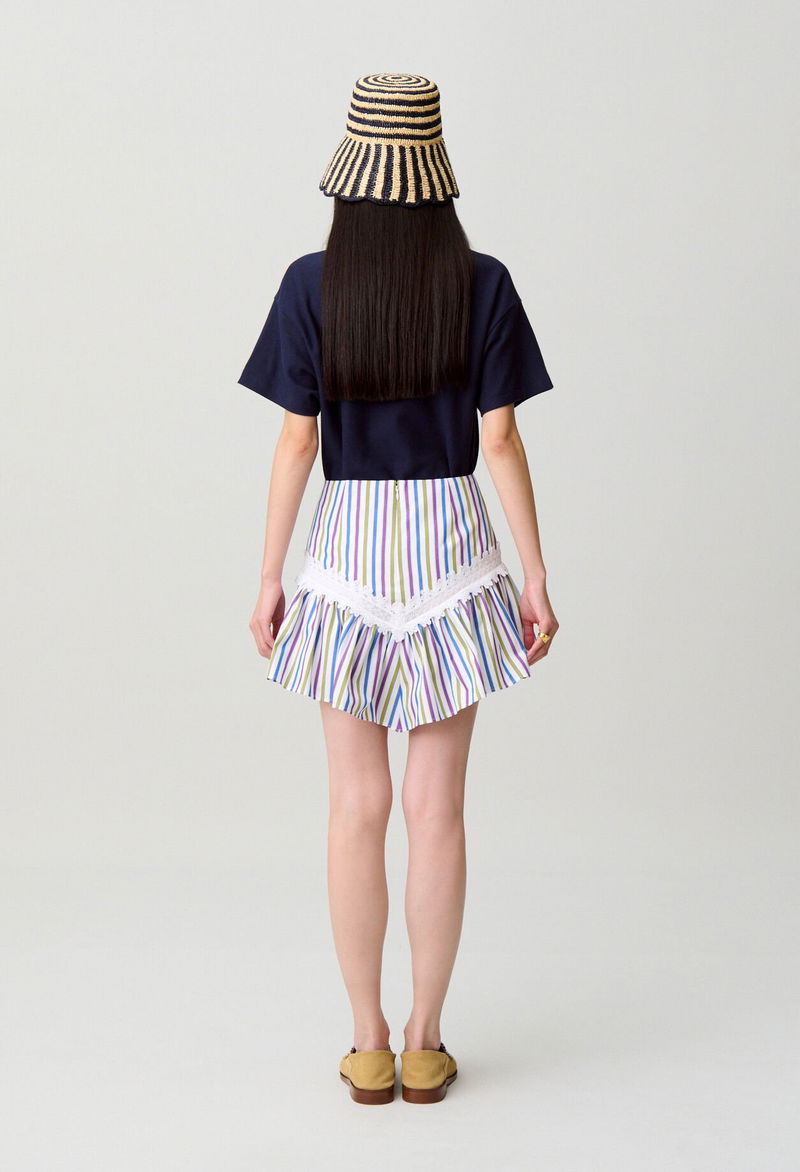 Short striped skirt with lace trim and gathered detailing for a voluminous effect