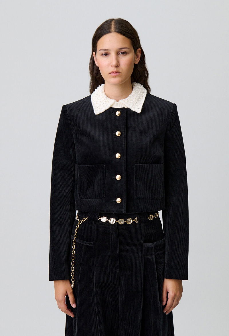 Our studio was inspired by the Yuppie movement (Young Urban Professional), emblematic of New York office wear in the 80s. This historically masculine wardrobe has been completely reinvented in a feminine version. Pastel colours - parma or sky blue - and mischievous details, like the jewel button, make up a silhouette that blends formal codes with a casual spirit.