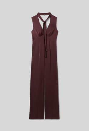 Long straight-fit jumpsuit with fitted waist and satin-finish inserts. Sleeveless, round neck, removable tie belt, belt loops, zip fastening.