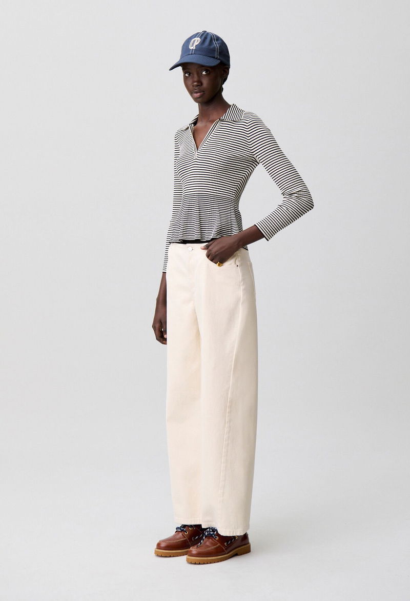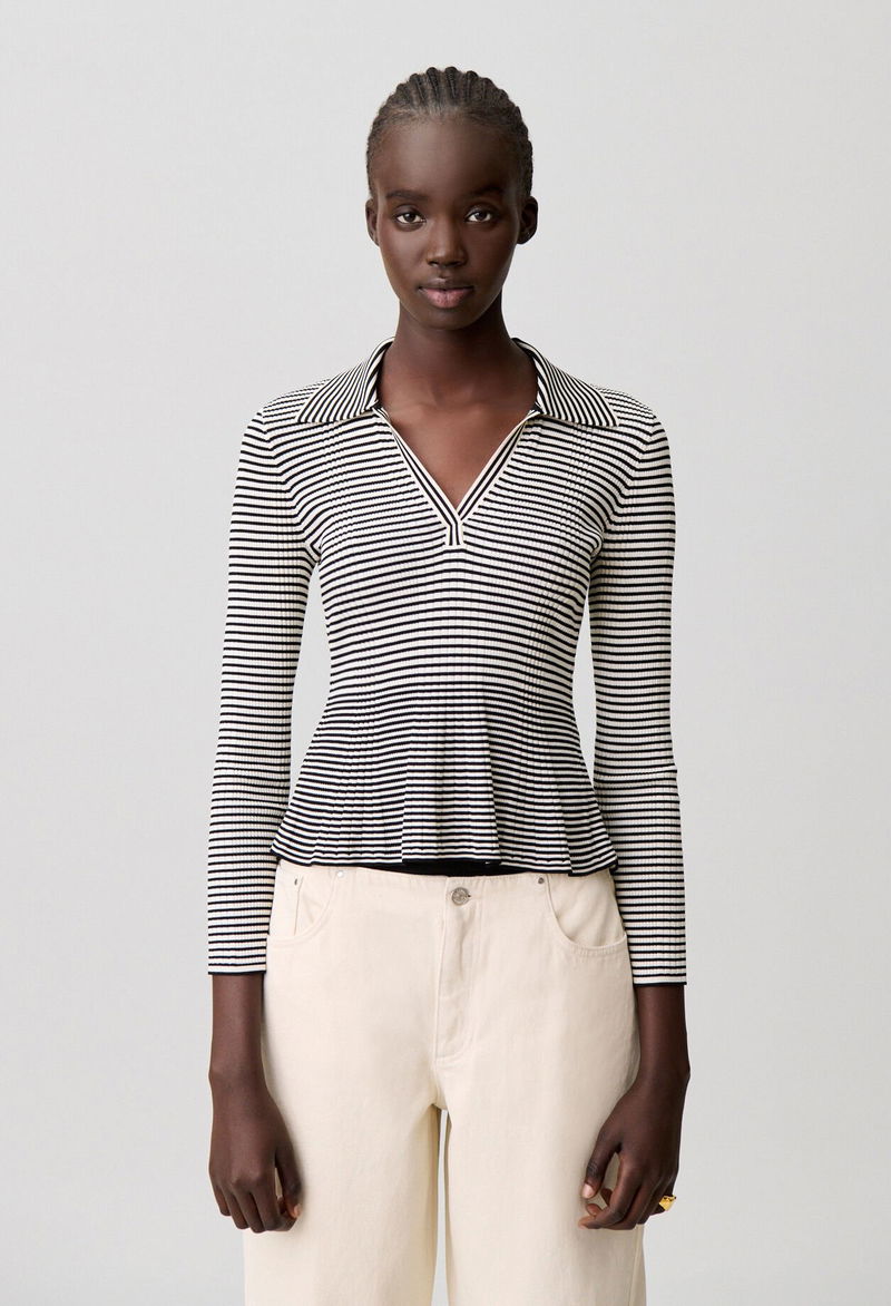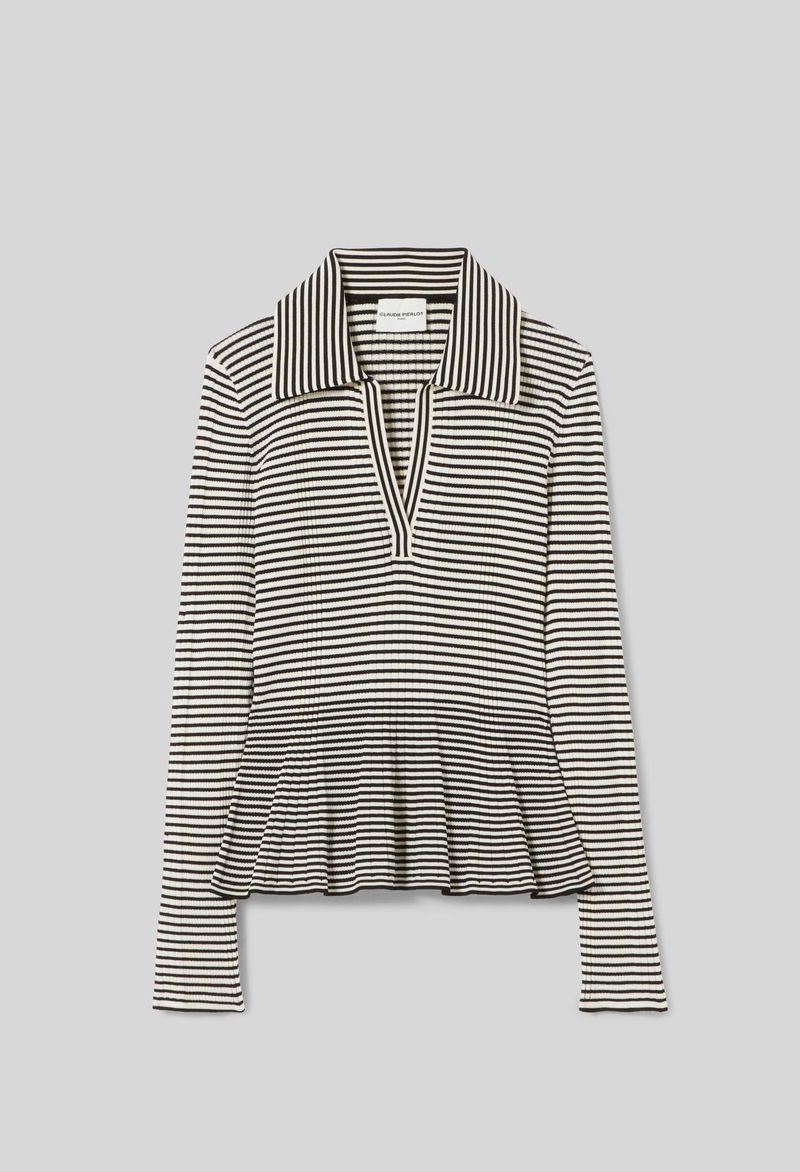 Fine-knit polo top with horizontal stripes.