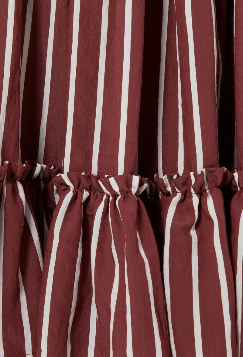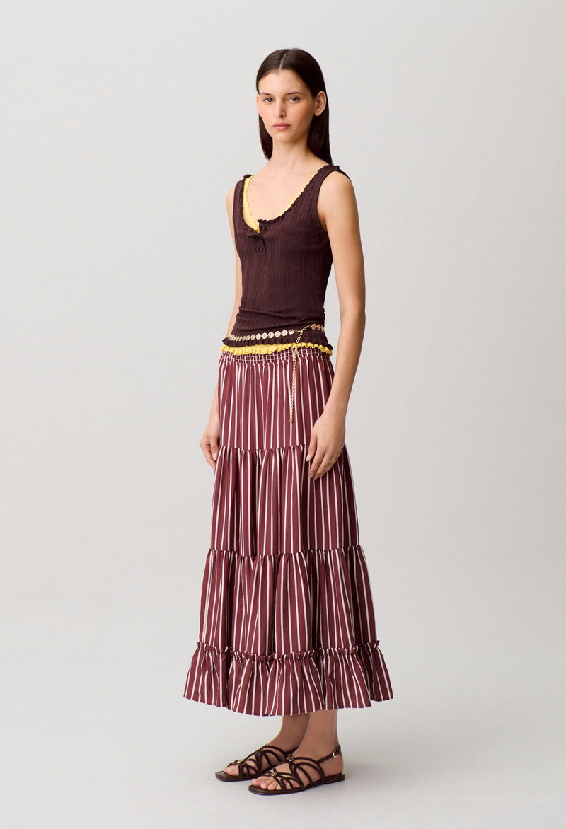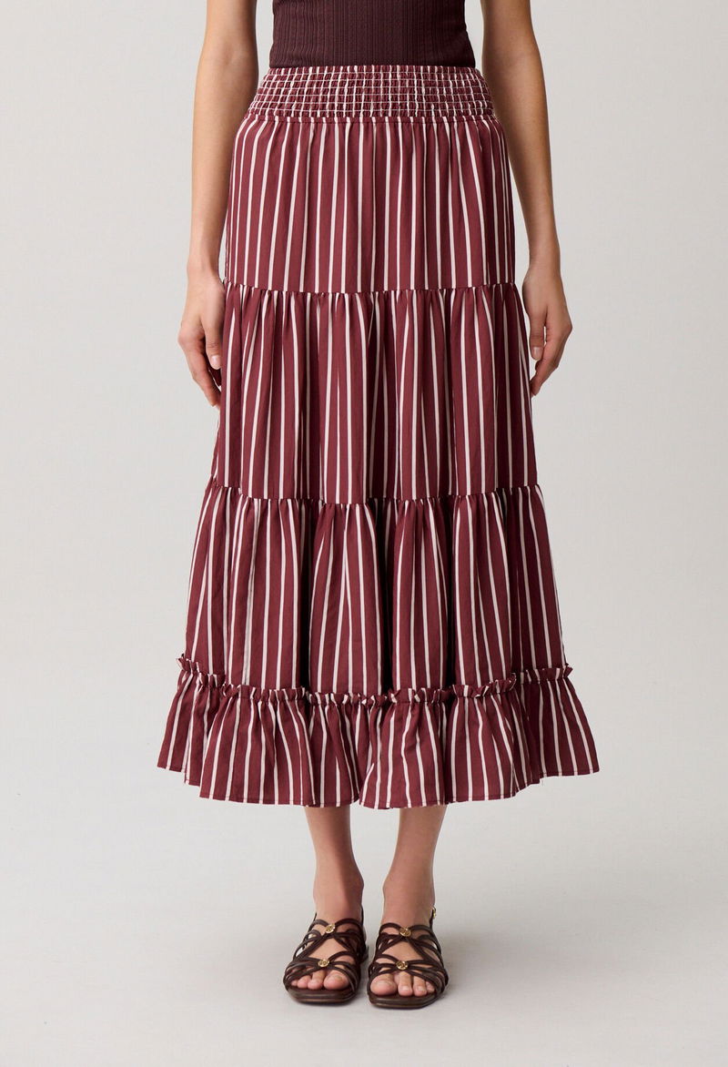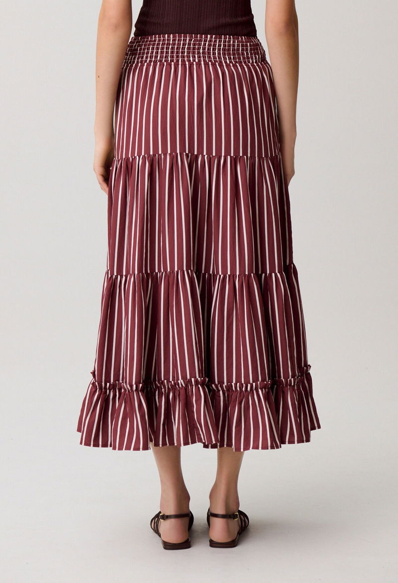 Long striped skirt with an elasticated waist. Long striped skirt. Regular elasticated waist. 3 main gathered panels. Ruffle at the hem.