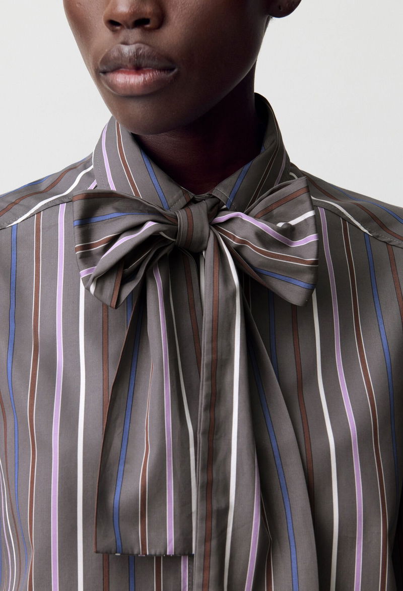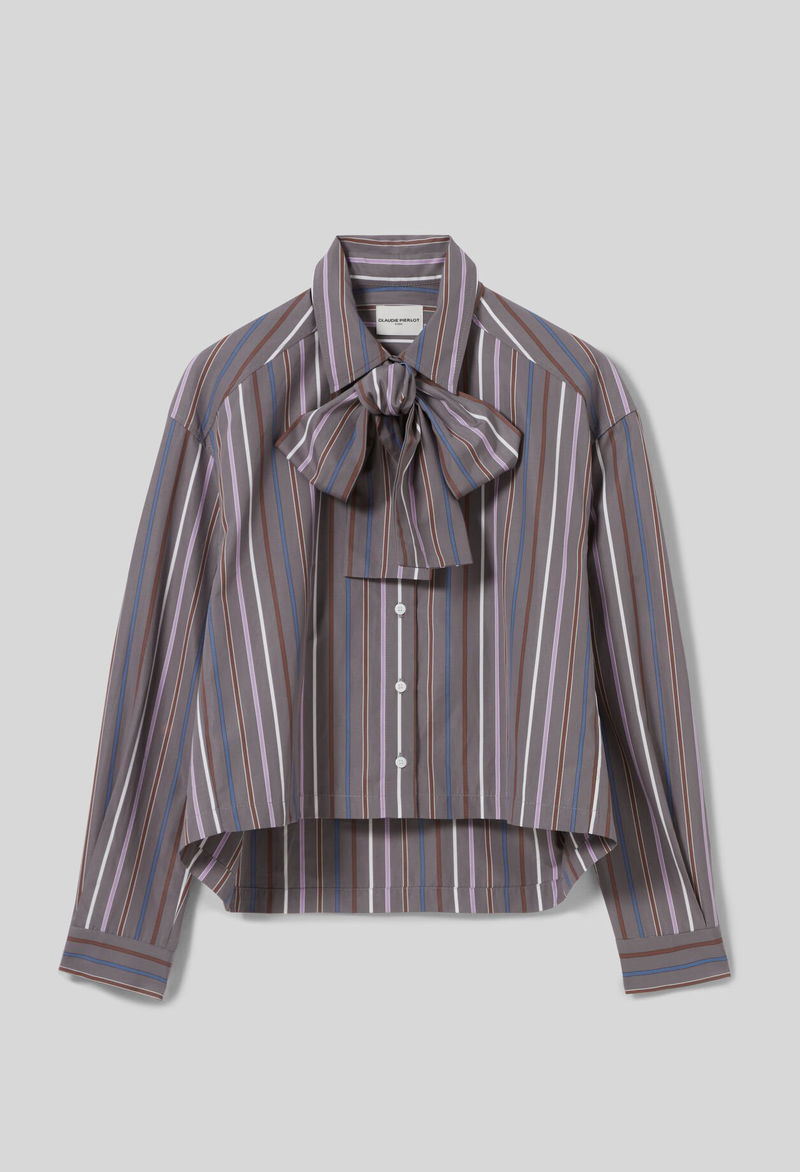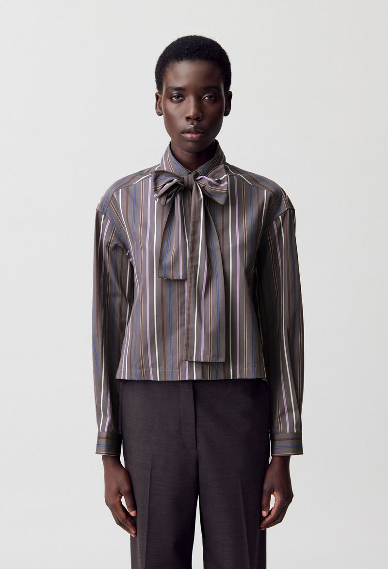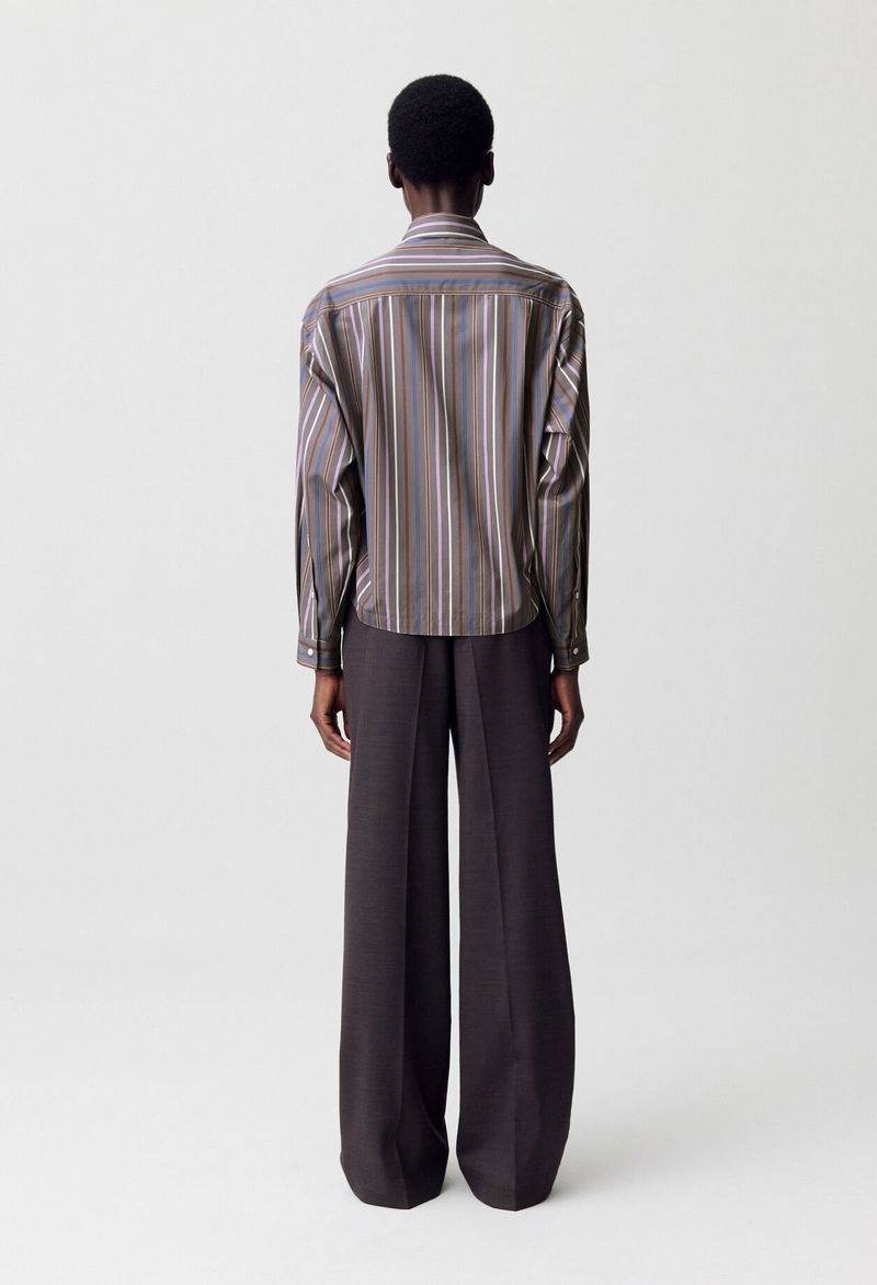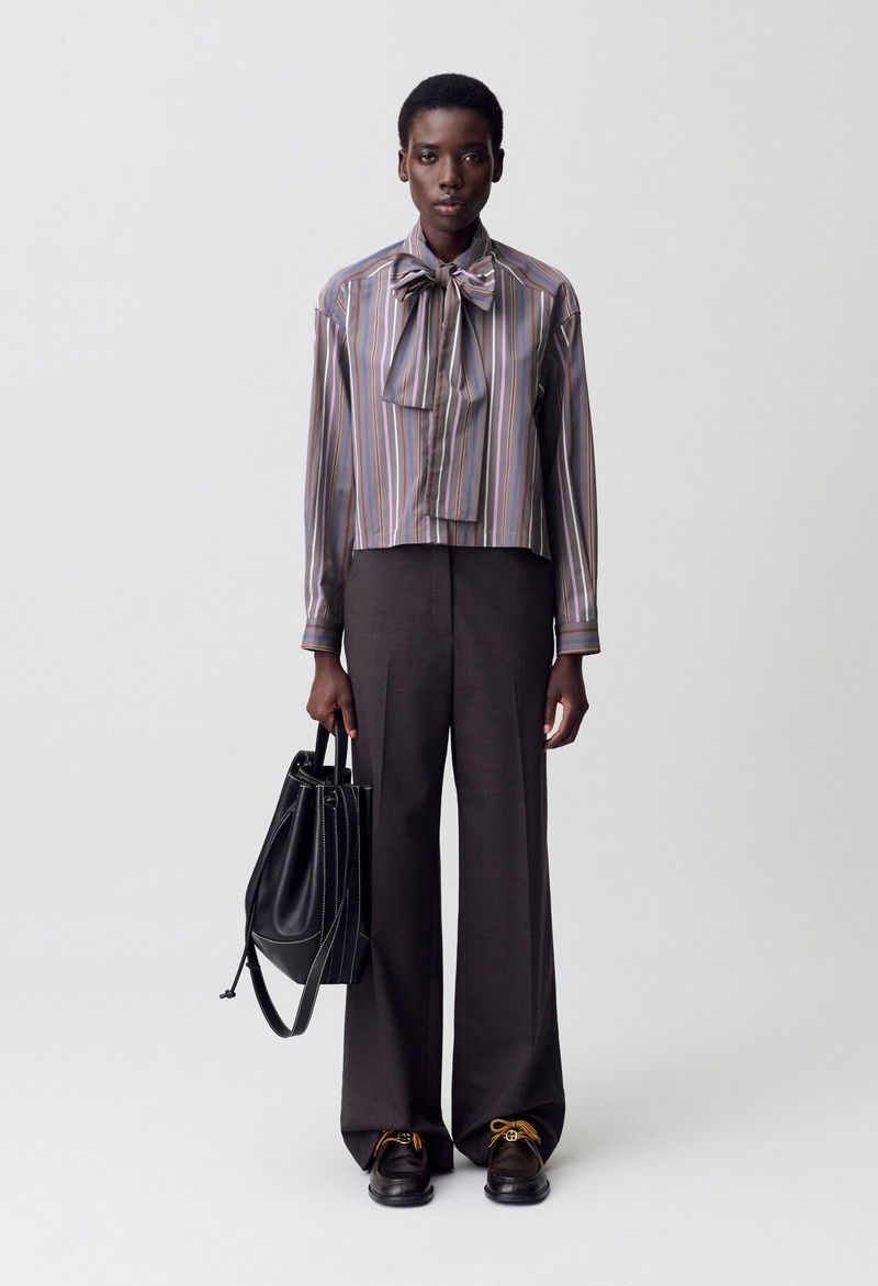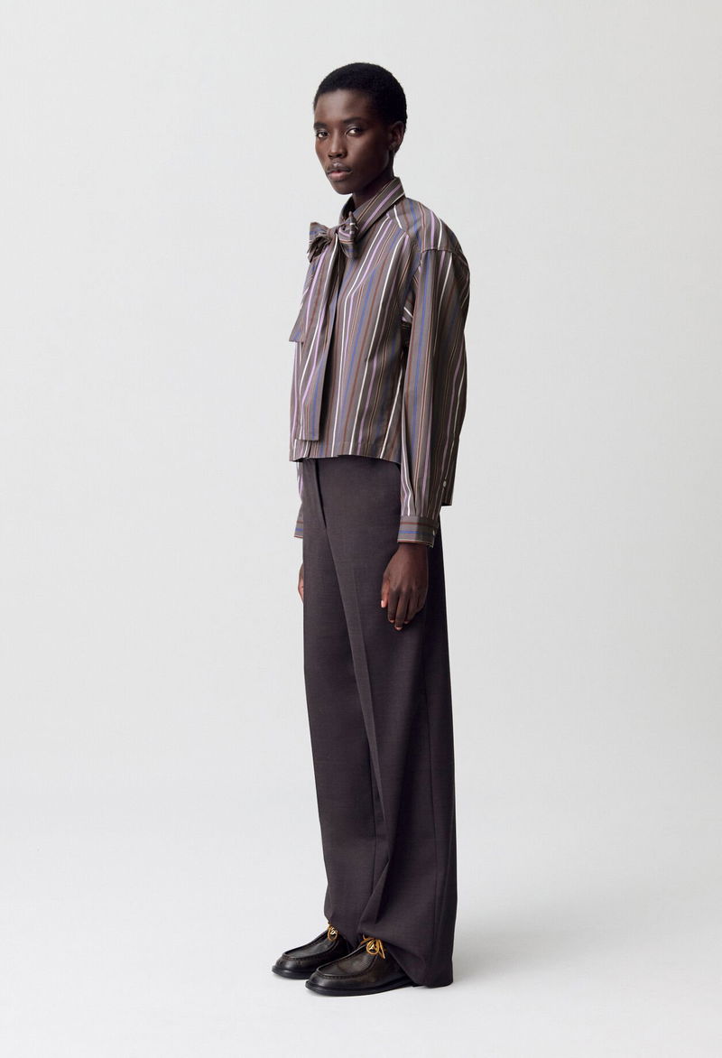 Our studio was inspired by the Yuppie movement (Young Urban Professional), emblematic of New York office wear in the 80s. This historically masculine wardrobe has been completely reinvented in a feminine version. Pastel colours - parma or sky blue - and mischievous details, like the jewel button, make up a silhouette that blends formal codes with a casual spirit.