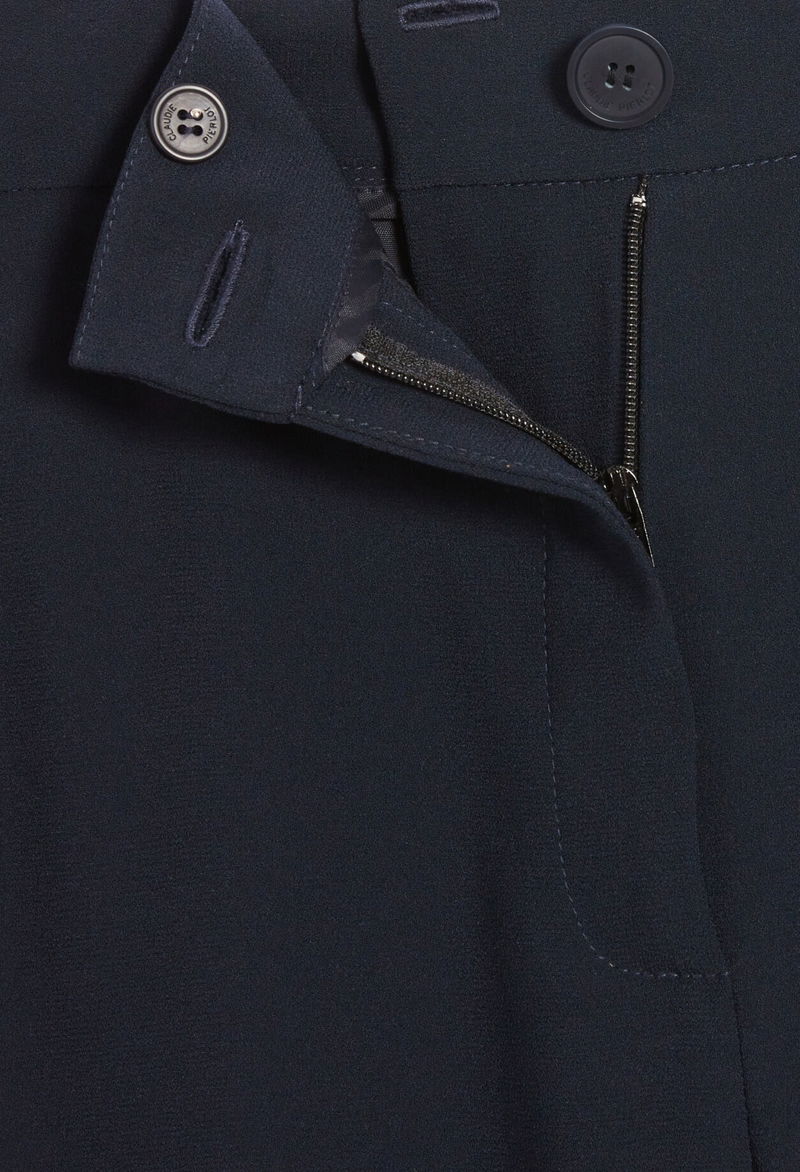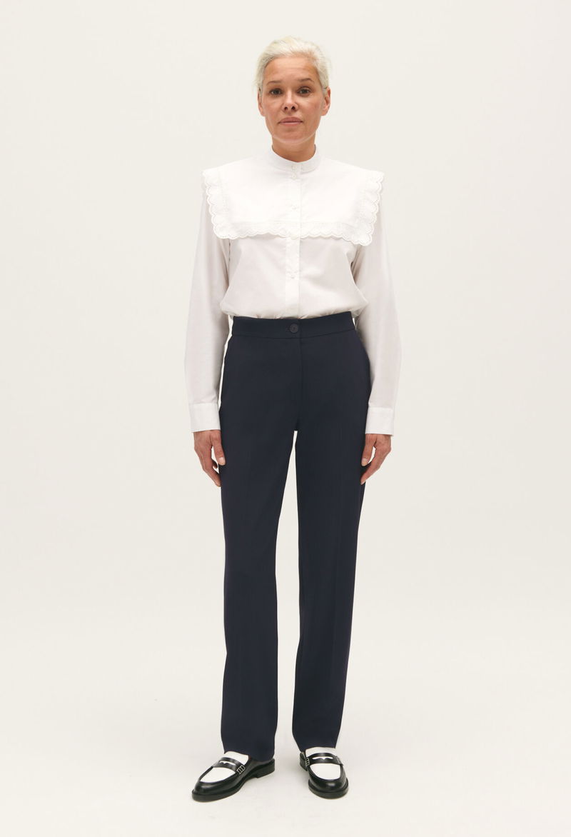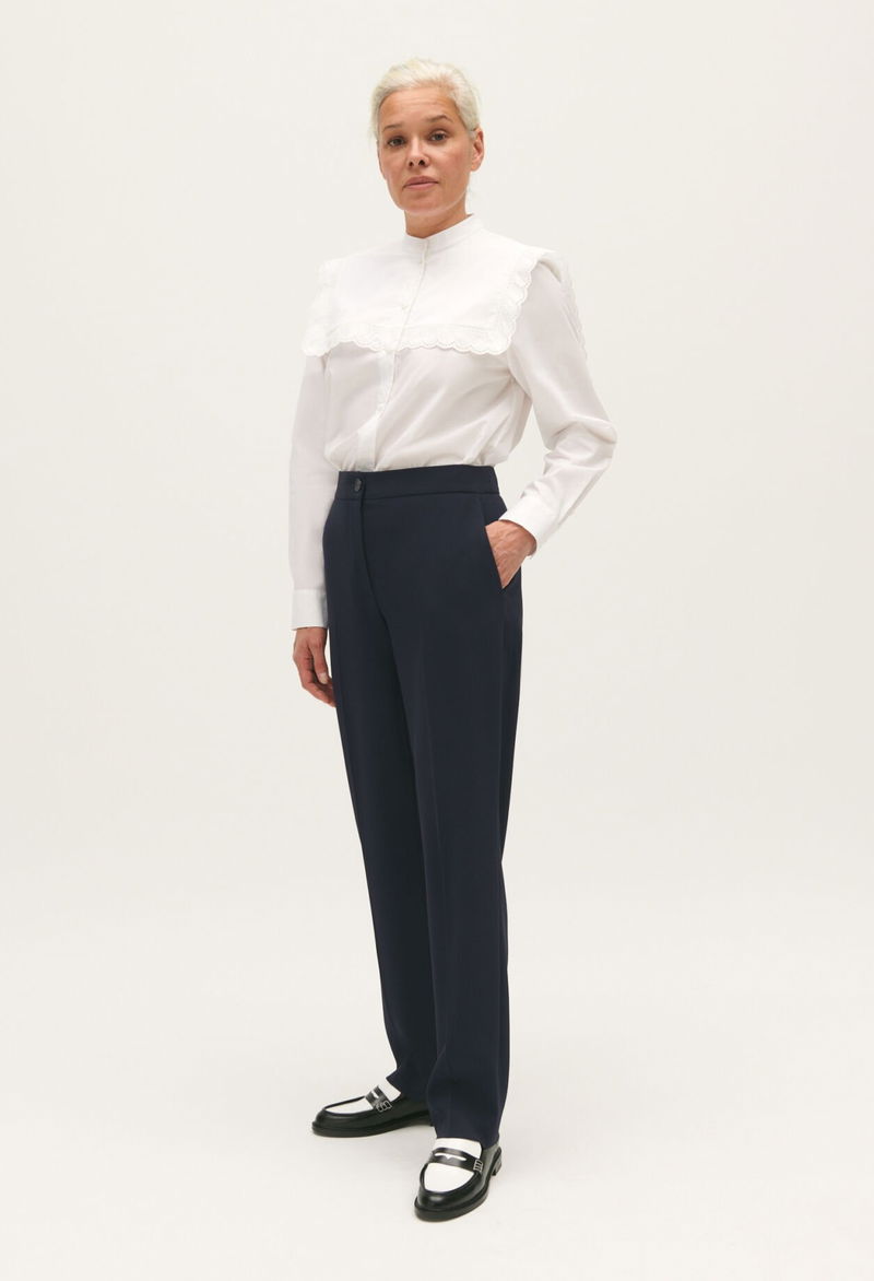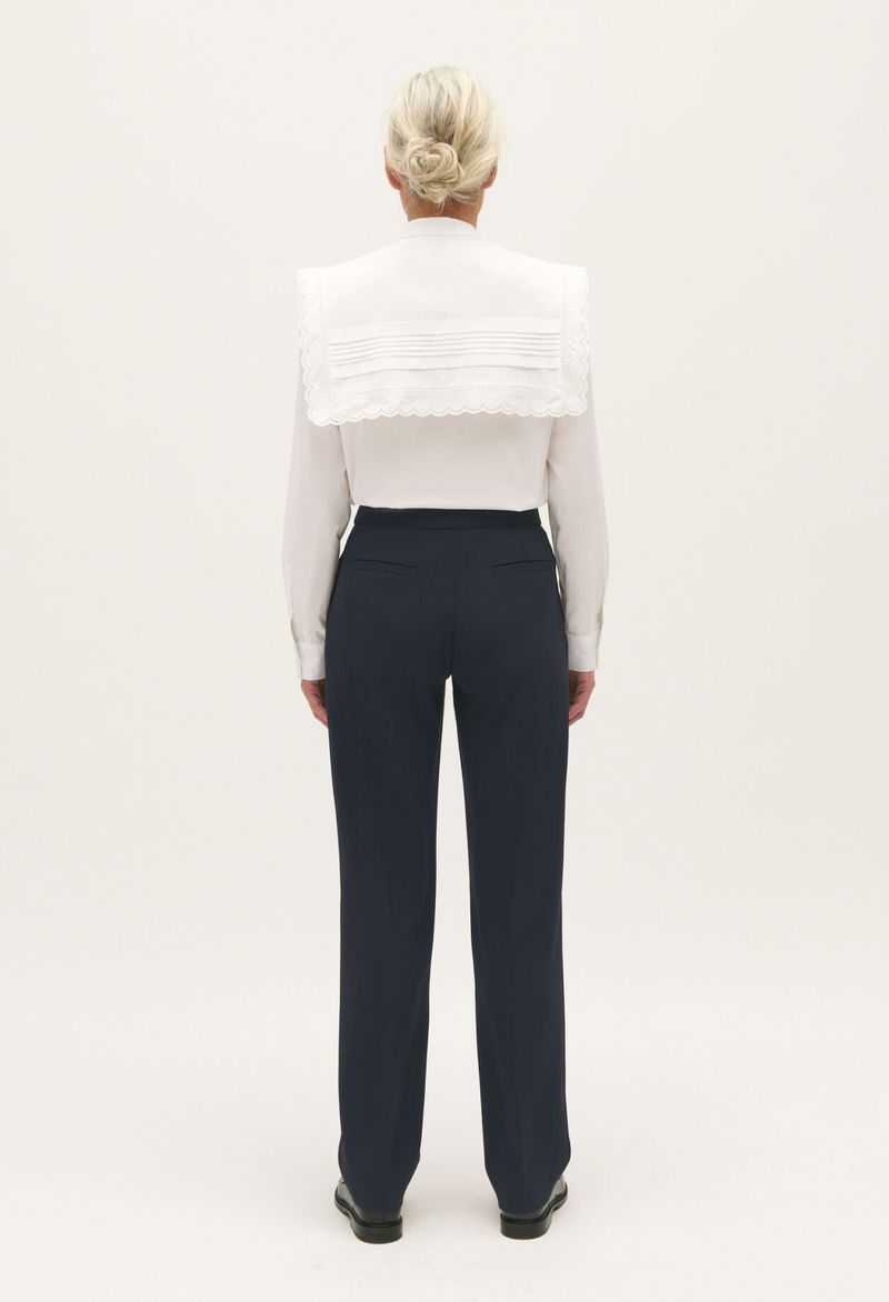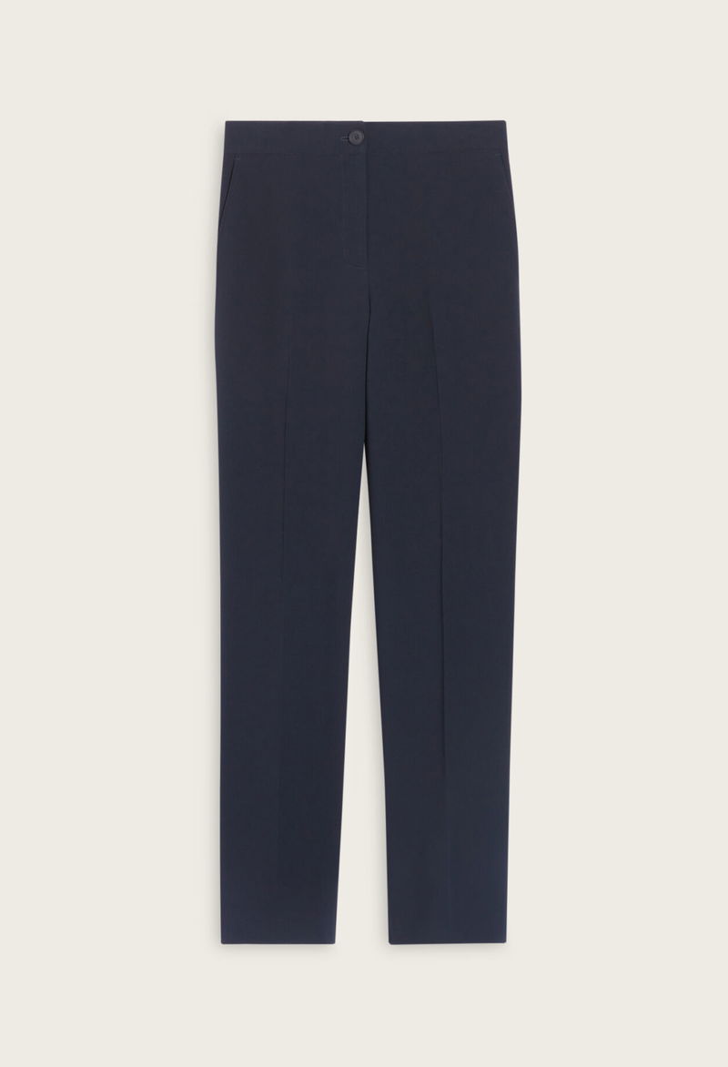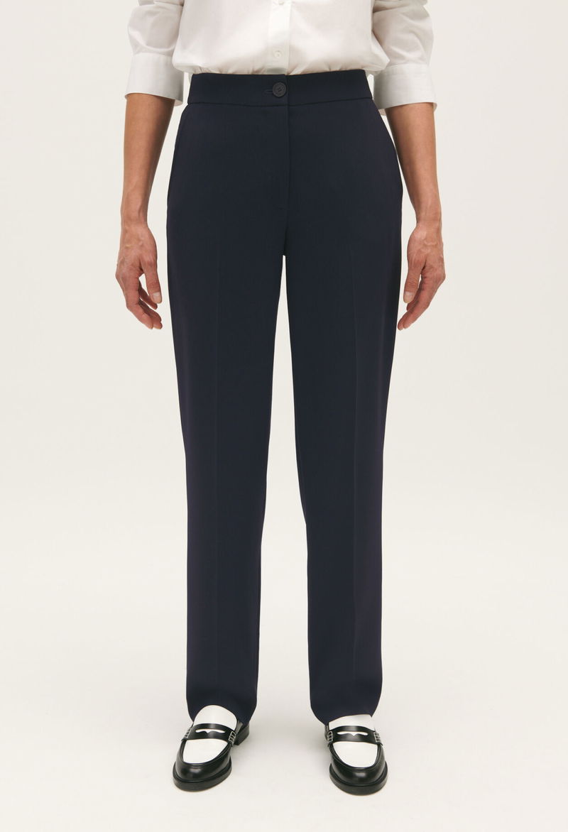 Straight fit and mid-rise waist suit trousers. Ironed creases down the middle of the legs and at the back. 2 slant pockets, 2 welt pockets on back. Zip and button fastening.