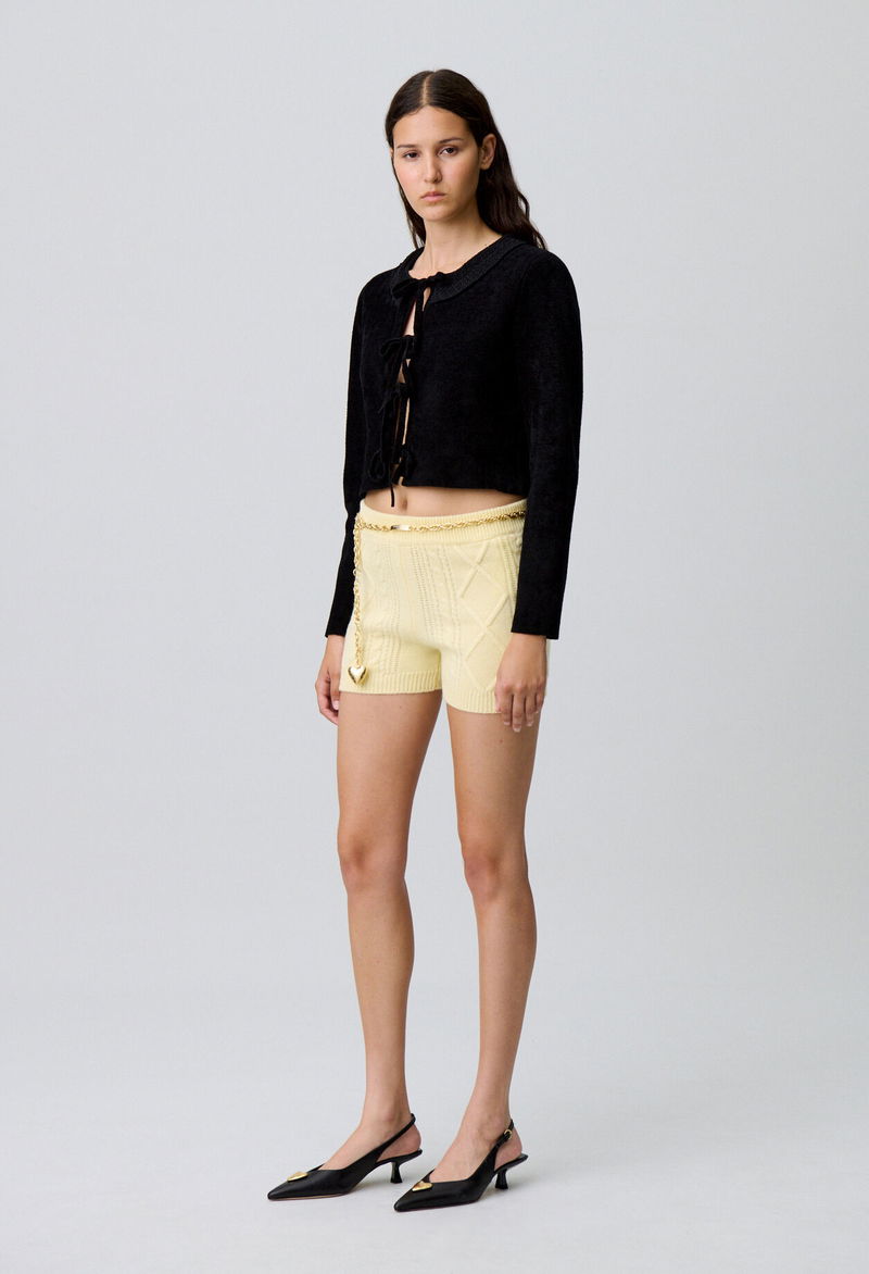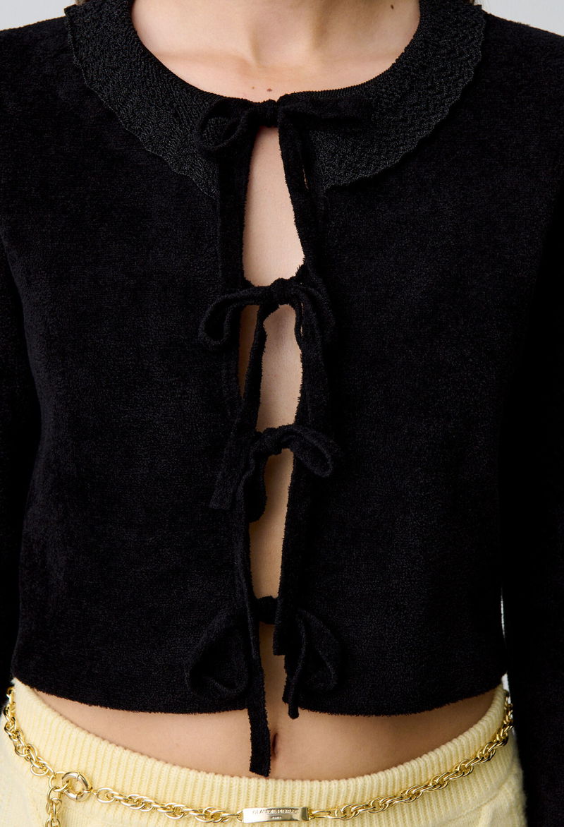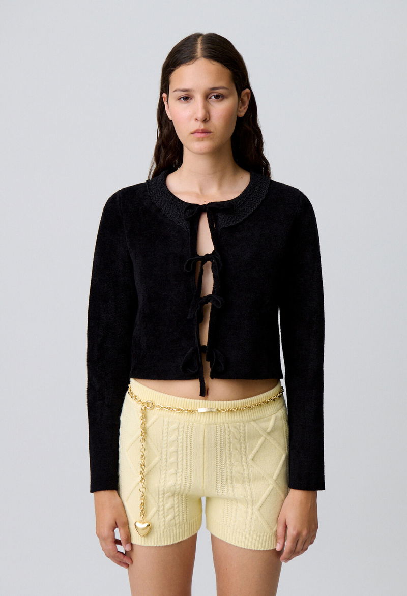 Long-sleeved velvet-effect knit cardigan. Collar with intricate Lurex thread knit detail. Ties along the bust to fasten the cardigan. Cropped length.