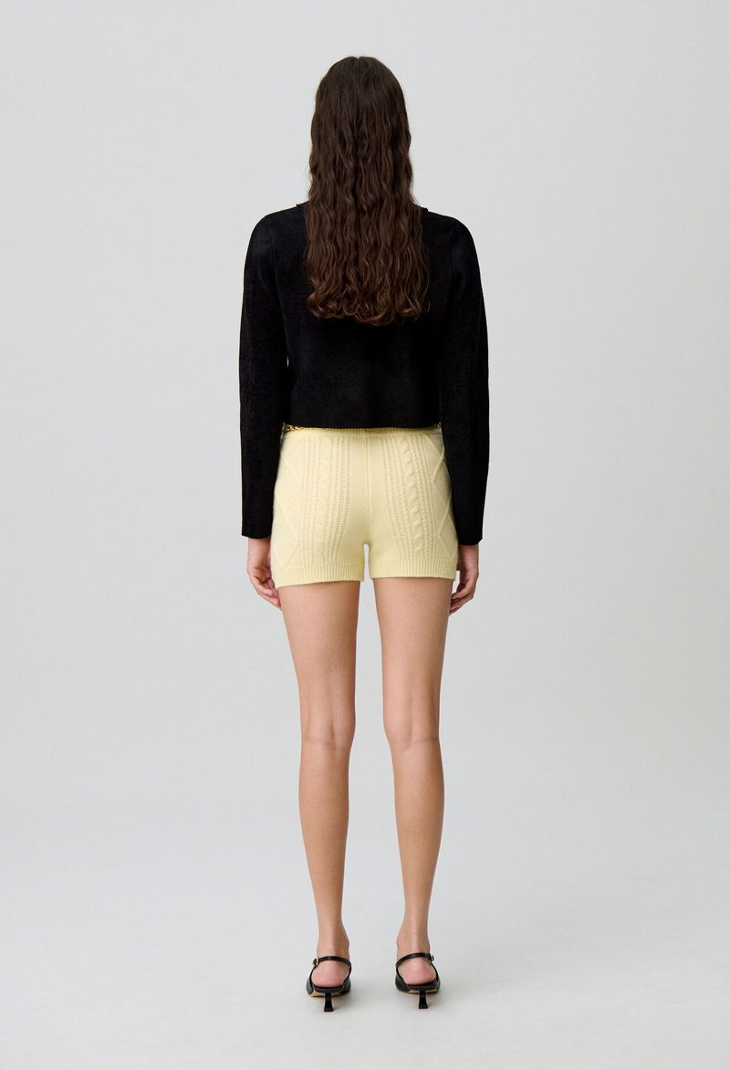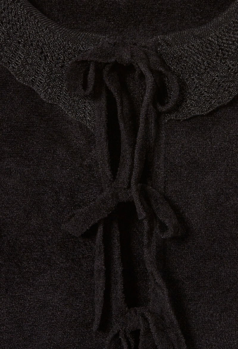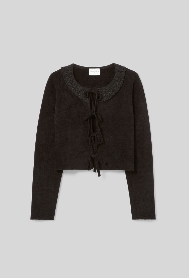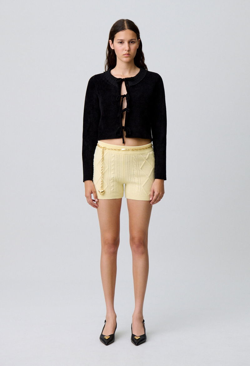 Long-sleeved velvet-effect knit cardigan. Collar with intricate Lurex thread knit detail. Ties along the bust to fasten the cardigan. Cropped length.