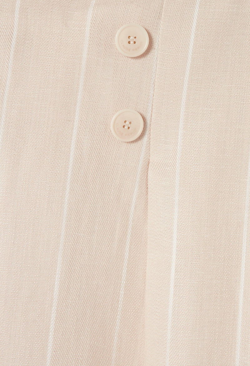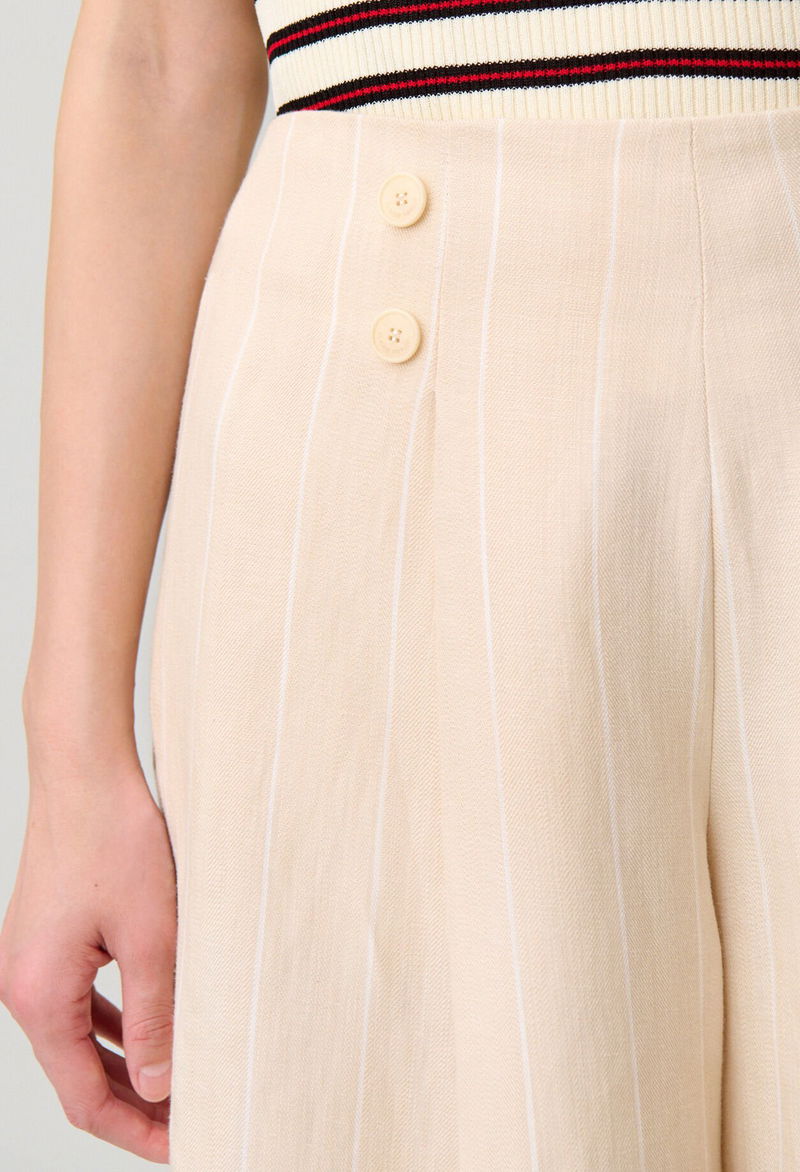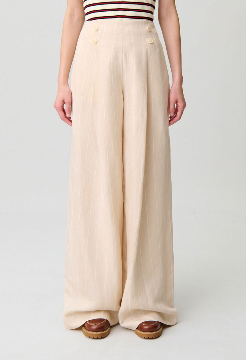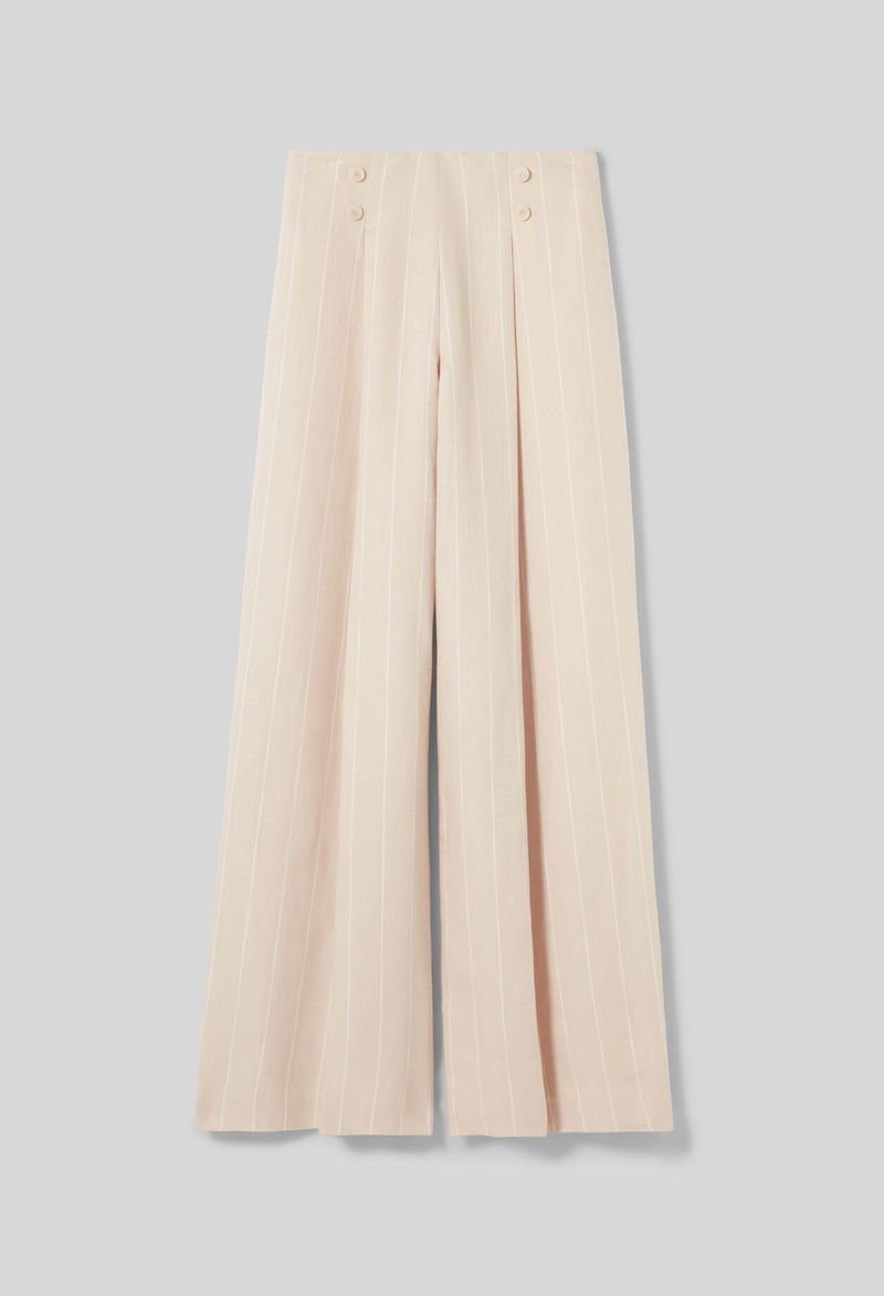 Wide-leg straight-cut tailored linen trousers. Regular-waist tailored trousers. Wide, straight legs. Two-button detail at the stitched pleat on each leg. Invisible hook and zip fastening.