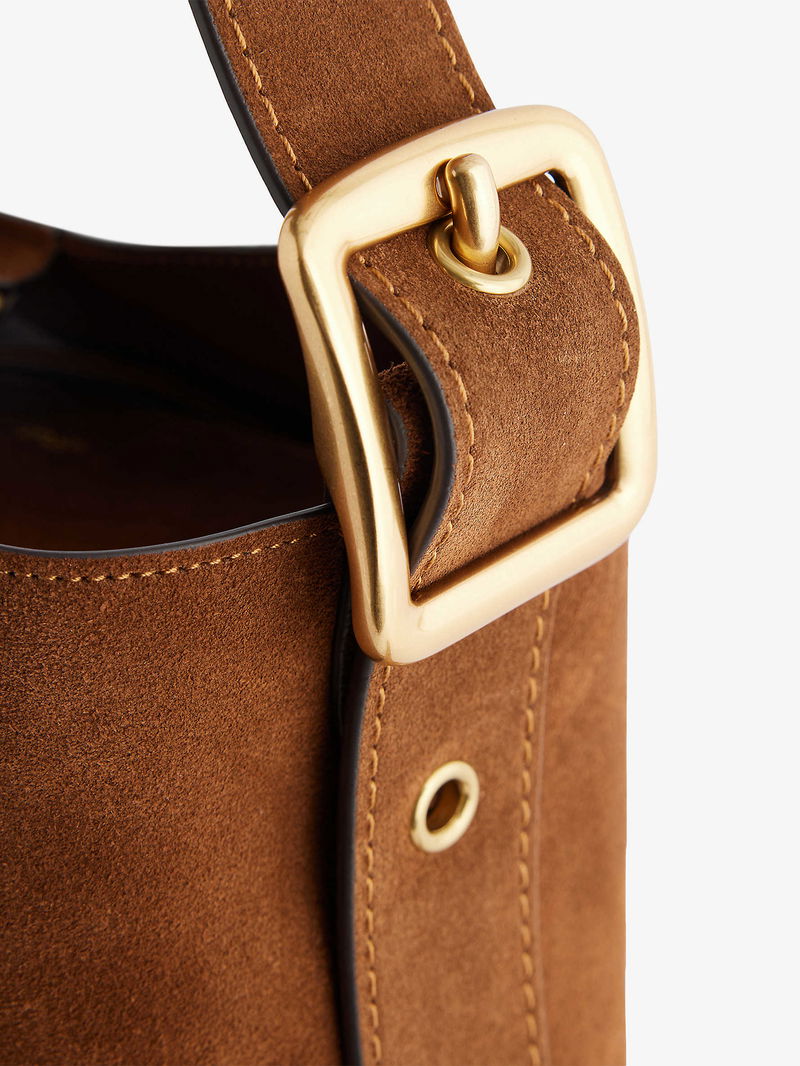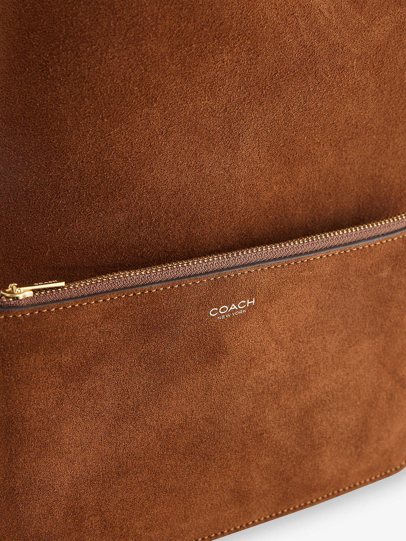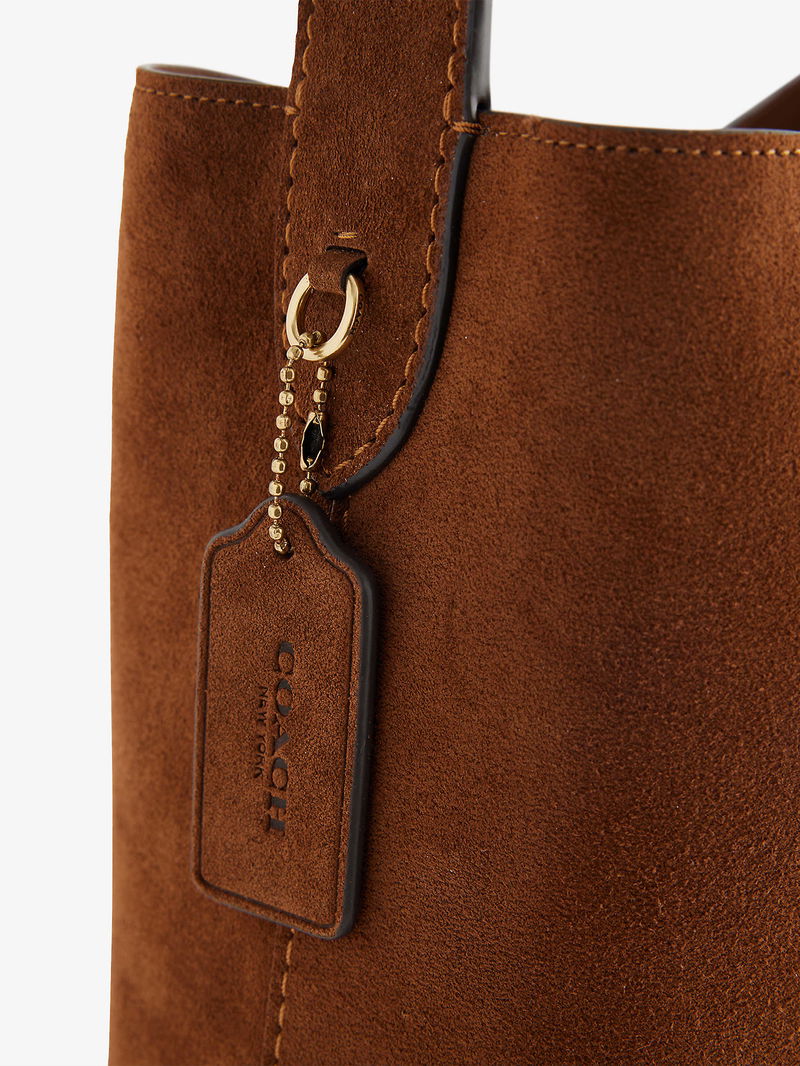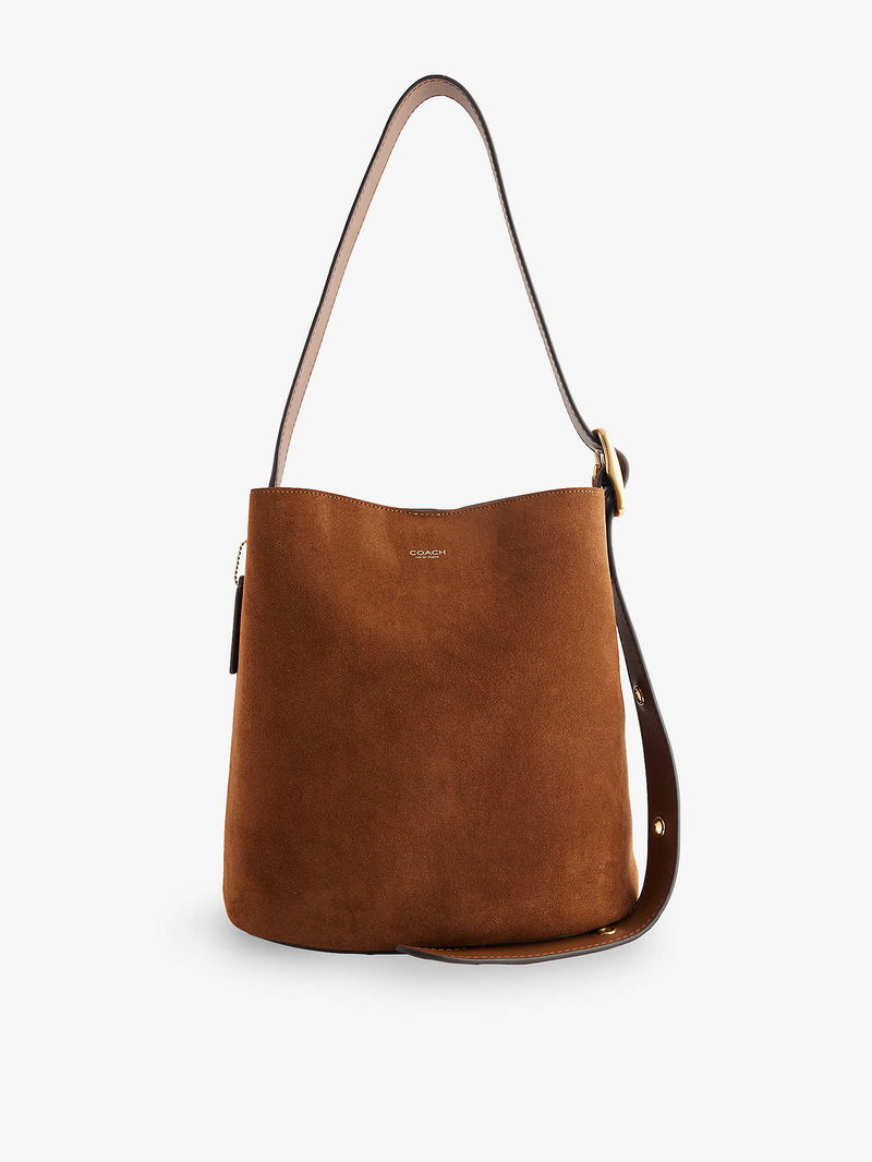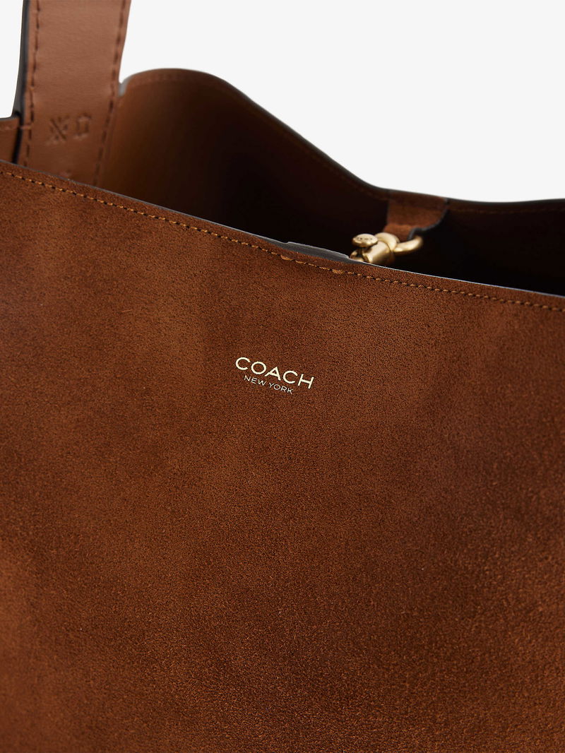 Coach leather-suede bucket bag. Structured shape, adjustable shoulder strap, foil-print logo, one main compartment, removable zip pouch.
