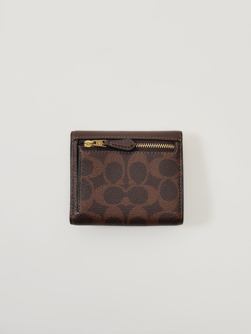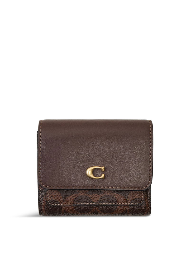 The Coated Canvas Signature Mila Small Flap Wallet in Maple features a durable coated canvas exterior with a classic signature design. Its compact flap style securely holds your cards and cash, combining convenience with refined style. The warm maple colour adds a touch of elegance, making it an ideal accessory for daily use or travel.