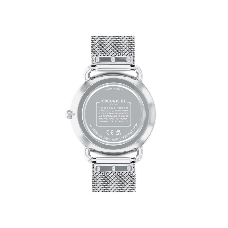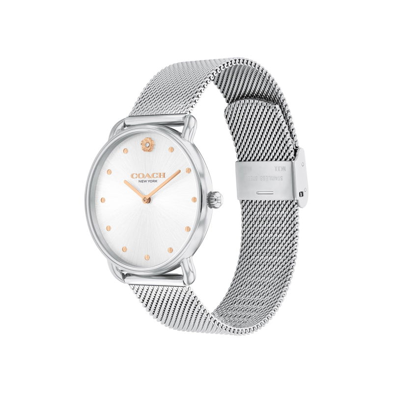 Coach ladies Elliot mesh watch. Featuring a 36mm case with white sunray dial finished with rose gold accents on a stainless steel or gold plated mesh bracelet.