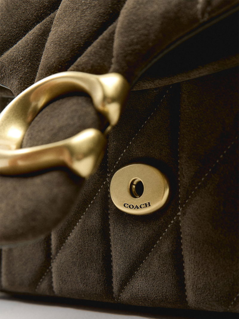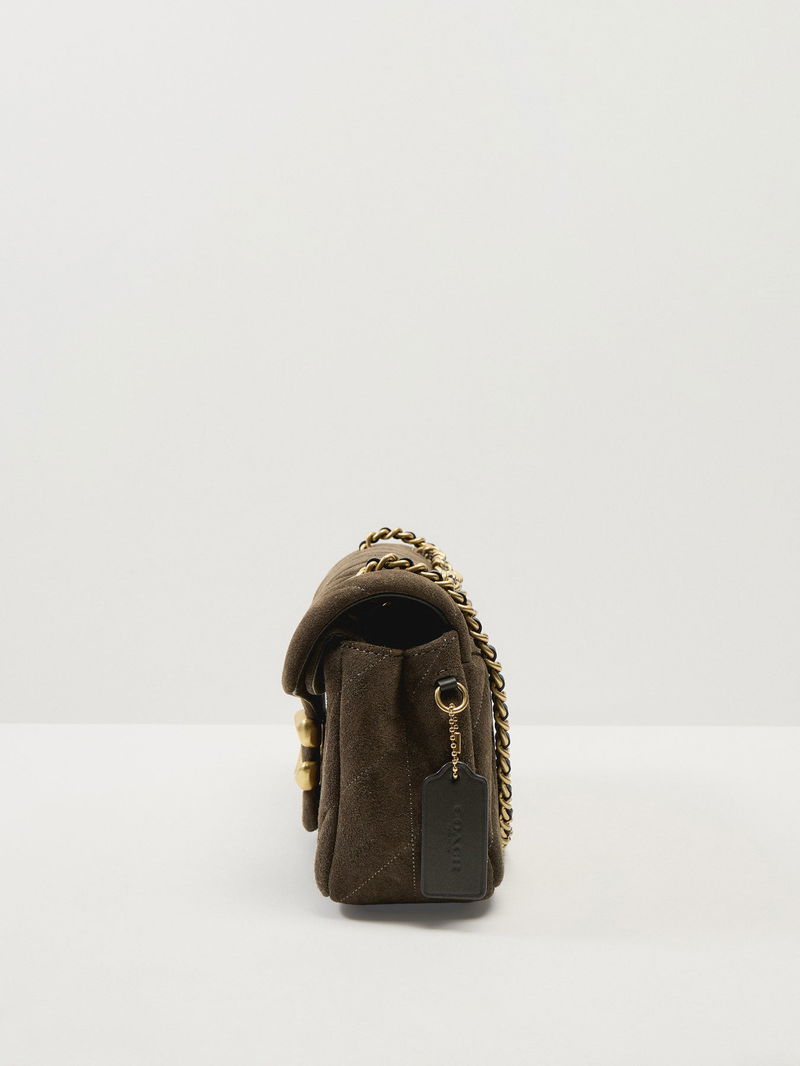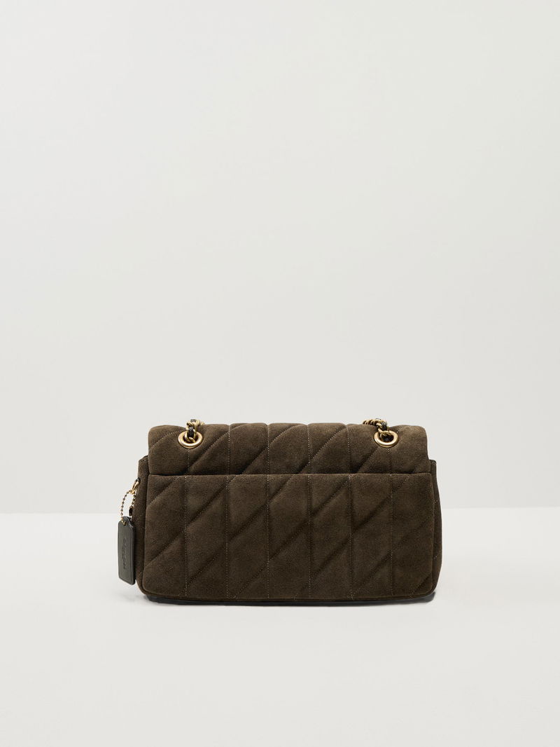 The Quilted Suede Tabby Shoulder Bag 26 in Olive features a soft suede exterior with elegant quilting detail. Its compact size offers convenient storage for essentials, while the chain strap adds a touch of sophistication and versatility for shoulder or crossbody wear. This bag combines style and practicality for everyday use.