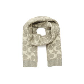 Coach woven scarf. Logo monogram jacquard, striped border, fringed trims.