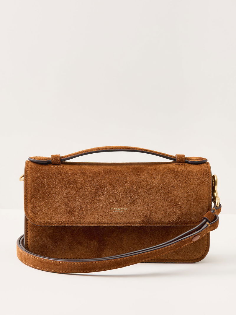 The Suede Elora Top Handle Crossbody Bag by Coach combines supple suede texture with a structured silhouette. Versatile in wear, it shifts easily between top-handle and crossbody styling. A refined everyday essential.