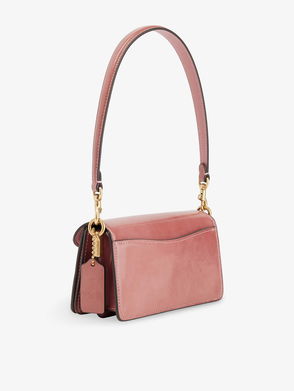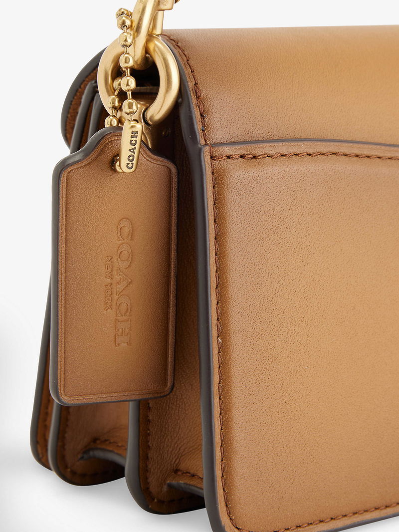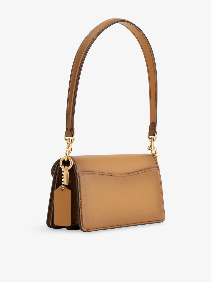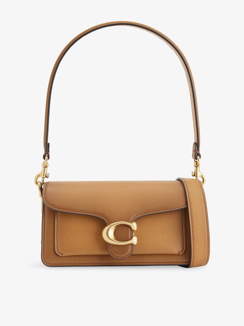 Coach leather shoulder bag. Rectangular shape, detachable top handle, detachable adjustable shoulder strap, brand design plaque at flap front, slip pocket at back, brand tag at side, all-over smooth leather, gold-toned hardware, two main compartments, internal zip pocket and two slip pockets, internal brand patch, fully lined.