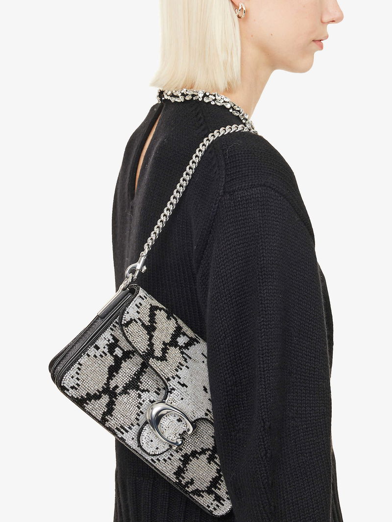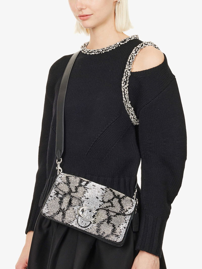 Coach leather shoulder bag. Rectangular shape, detachable top handle and adjustable shoulder strap, detachable chain strap, brand design plaque at flap front, brand tag at side, bead appliqué at front and back, leather trims, silver-toned hardware, two main compartments, internal buttoned pocket and debossed branding, fully lined.