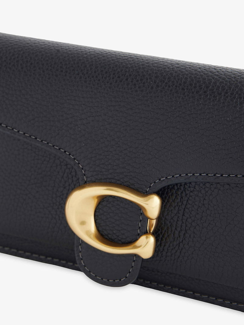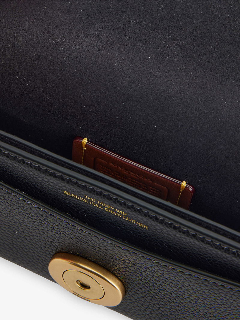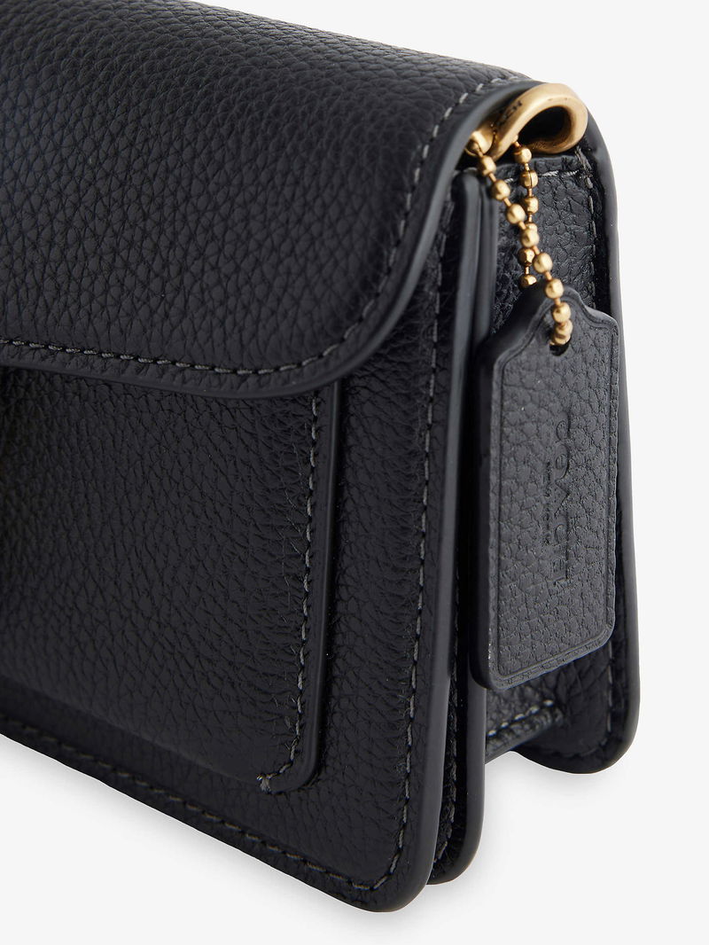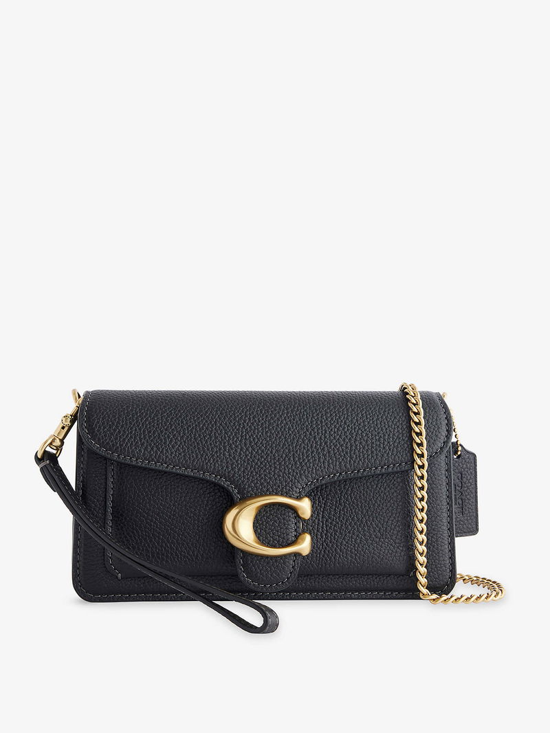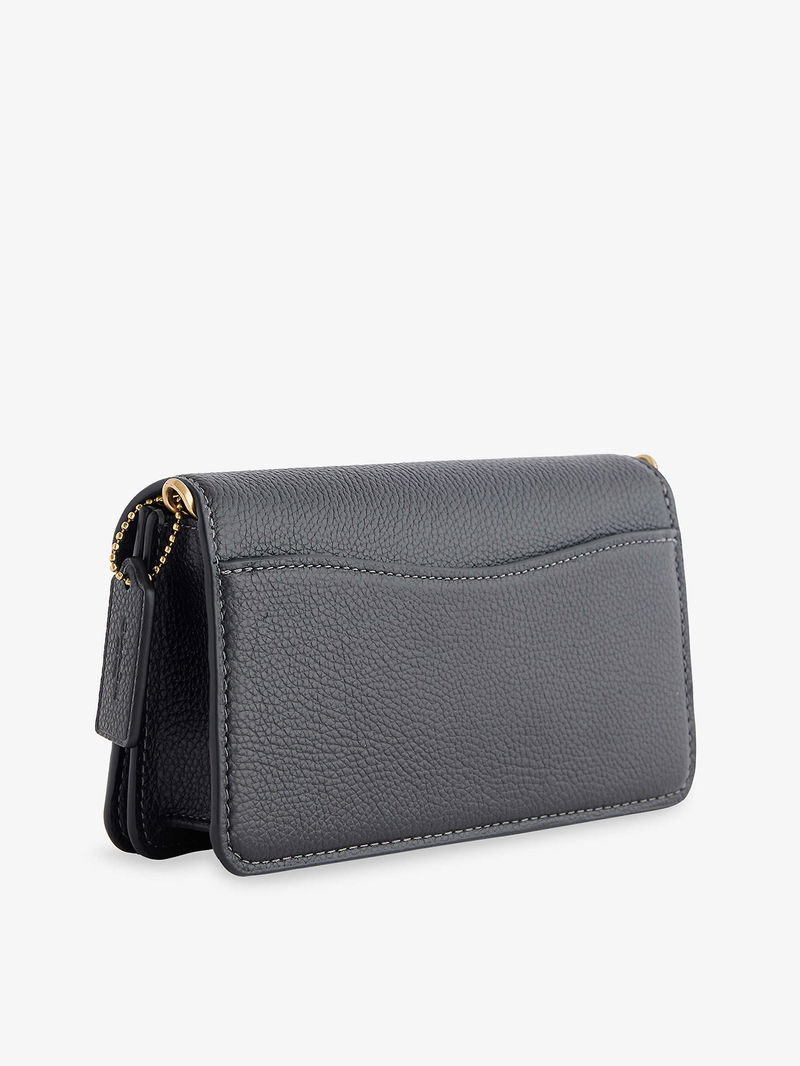 Coach leather shoulder bag. Magnetic-flap closure. Structured shape, detachable shoulder strap, logo hardware at front, slip pockets at front and back, one main compartment.