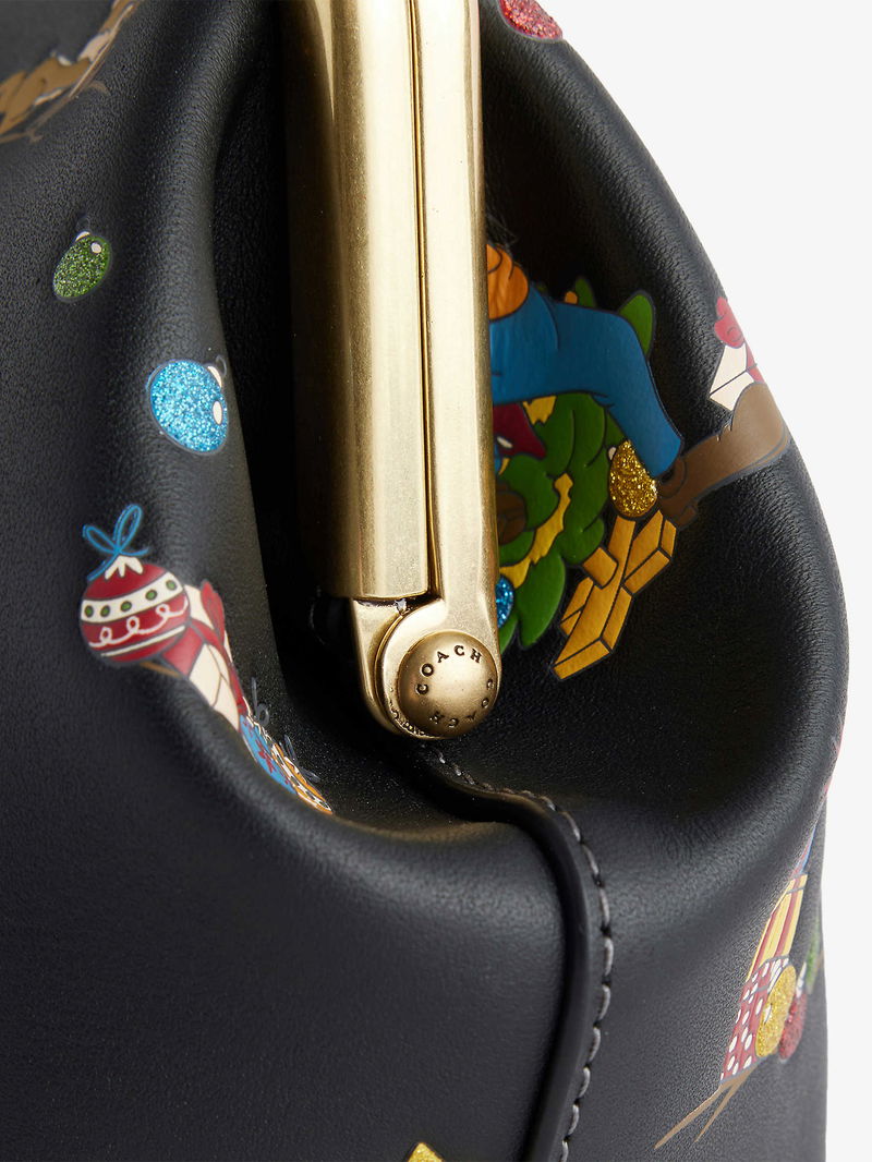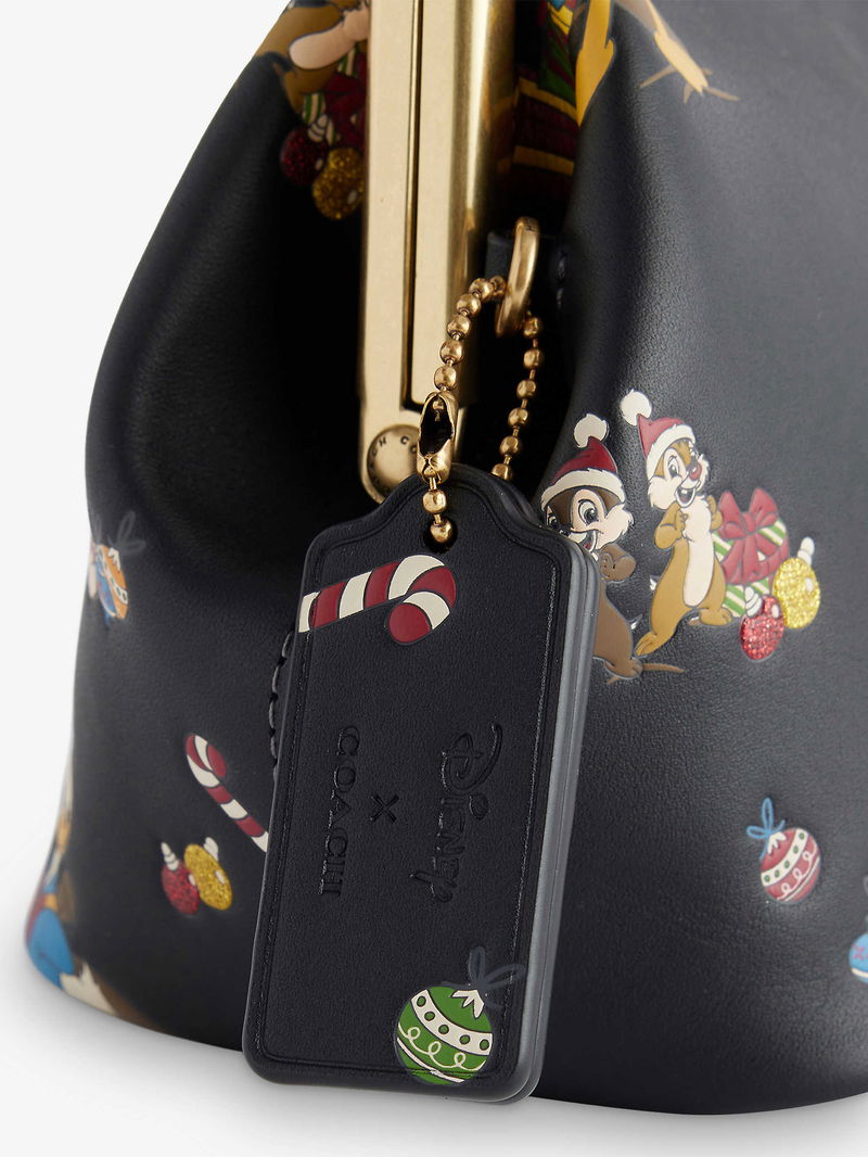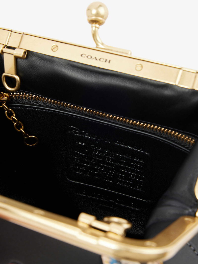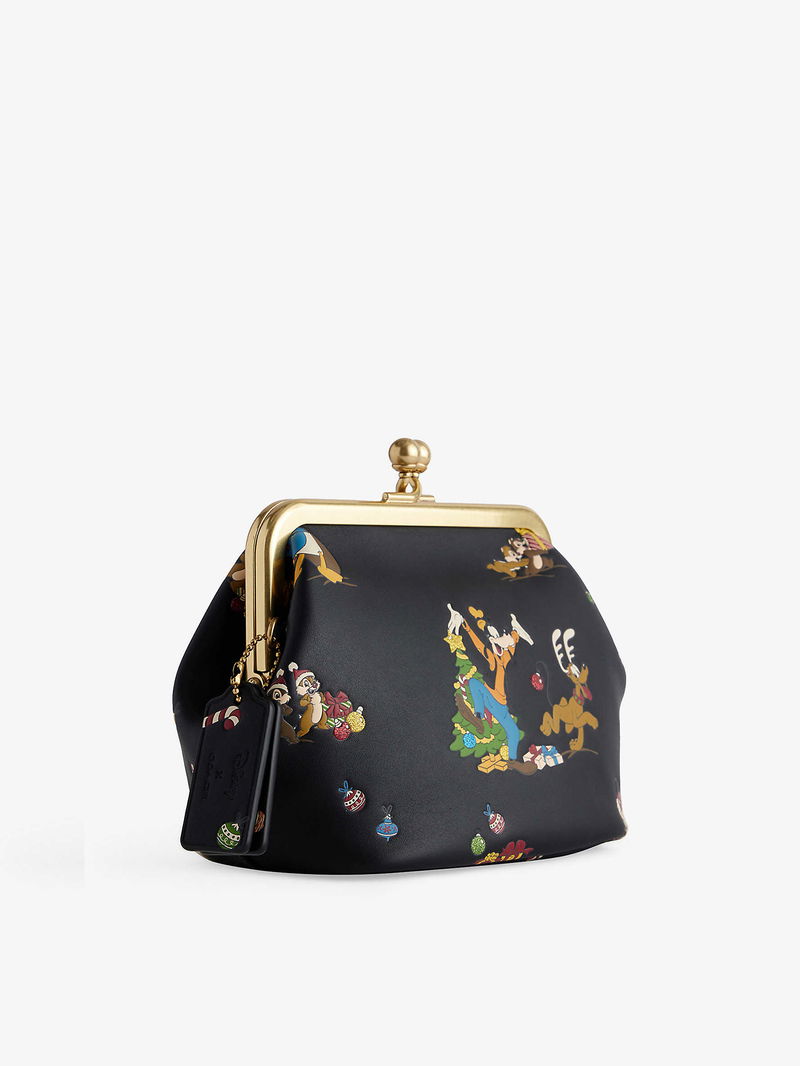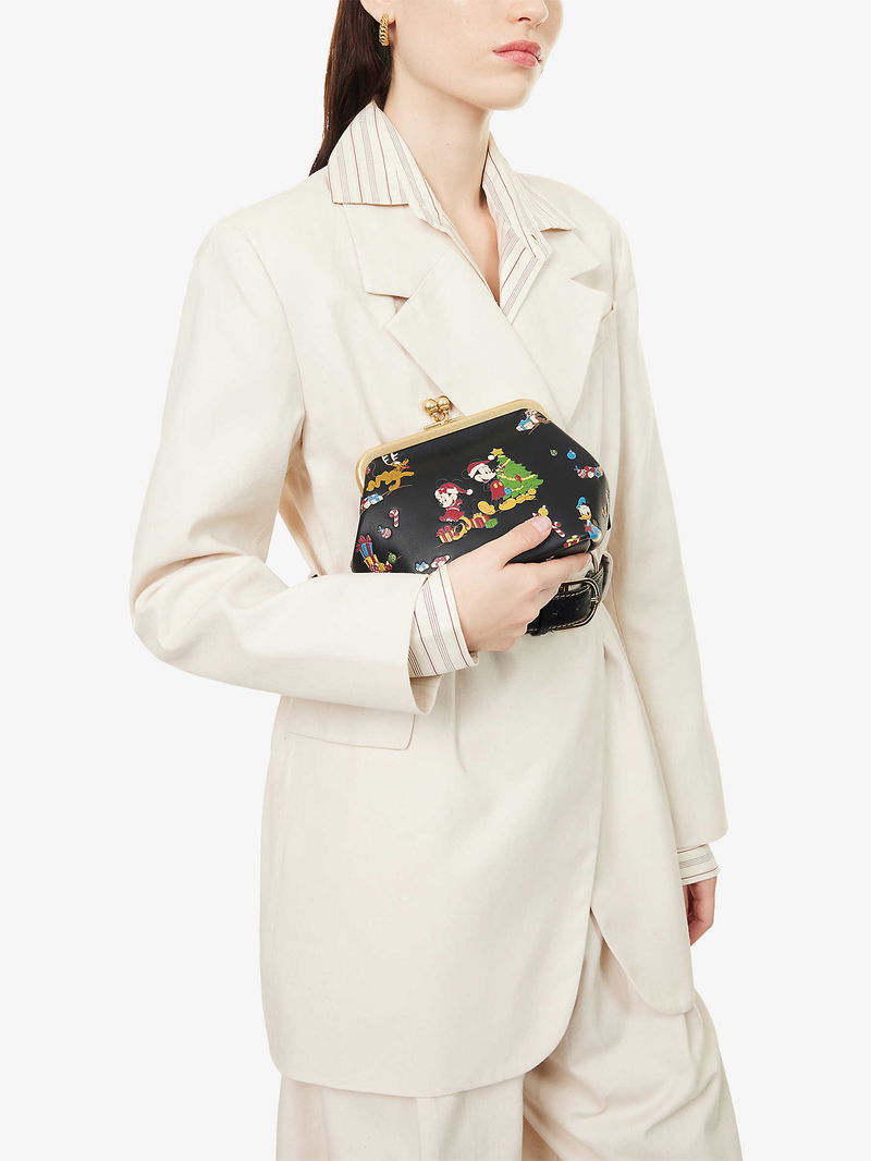 Coach x Disney leather clutch. All-over Disney characters print, all-over smooth leather, gold-toned hardware, one main compartment, internal zip pocket and engraved branding, fully lined.