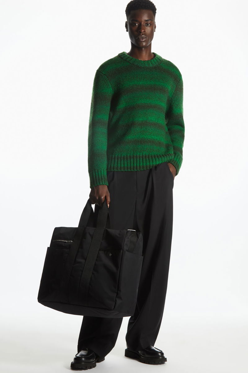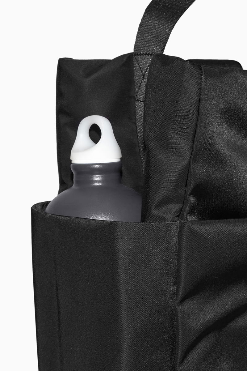 Made from waterproof recycled nylon, this practical black weekend bag can be carried from the top handle or worn across the body. It has multiple press stud-fastening pockets and a detachable, adjustable webbing strap for personalised wear with an aluminium buckle. Inside, there's a key clip as well as modern innovations including a back slip pocket that allows you to fasten the backpack to your suitcase for seamless travel.