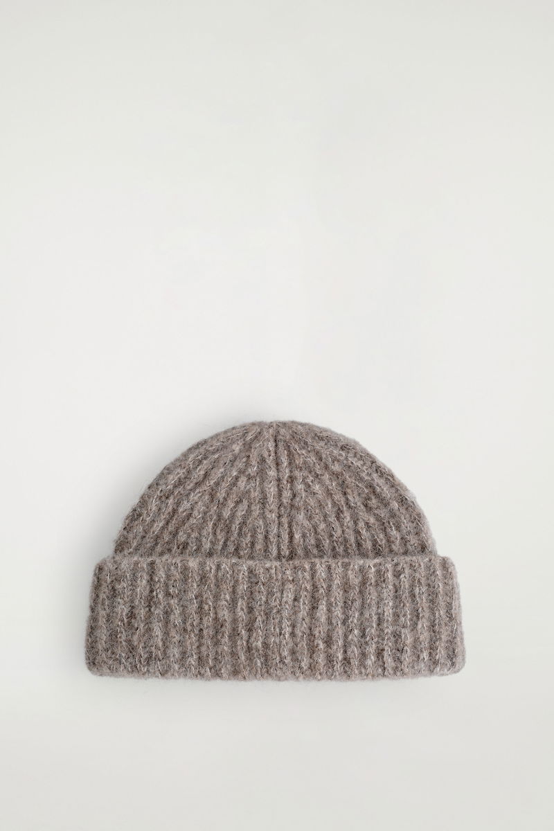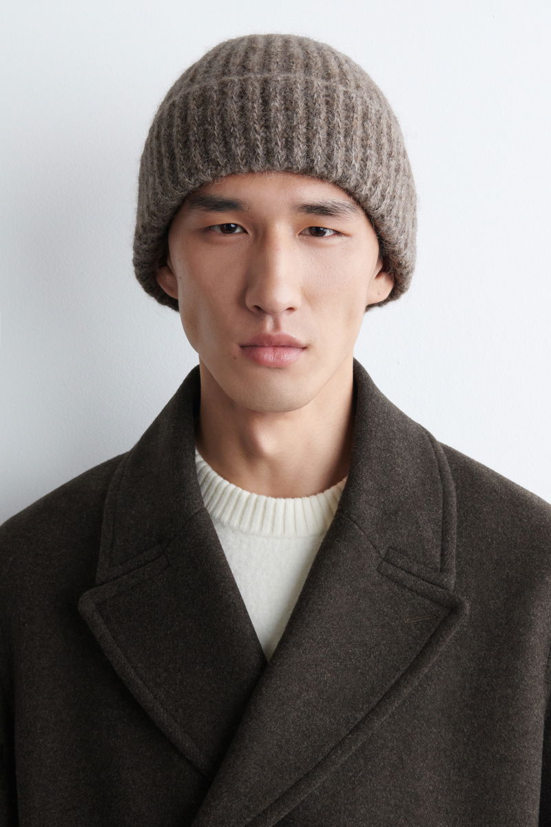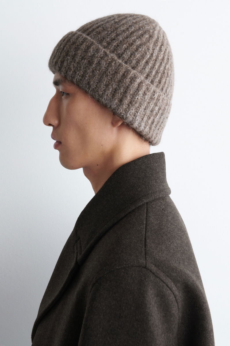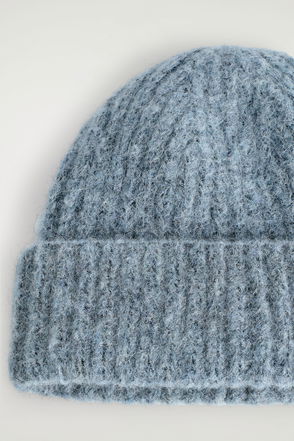 A modern take on the classic beanie, this hat is knitted with textured alpaca and wool yarn in a subdued blue hue. It's ribbed to keep warmth in and has a wide folded brim.